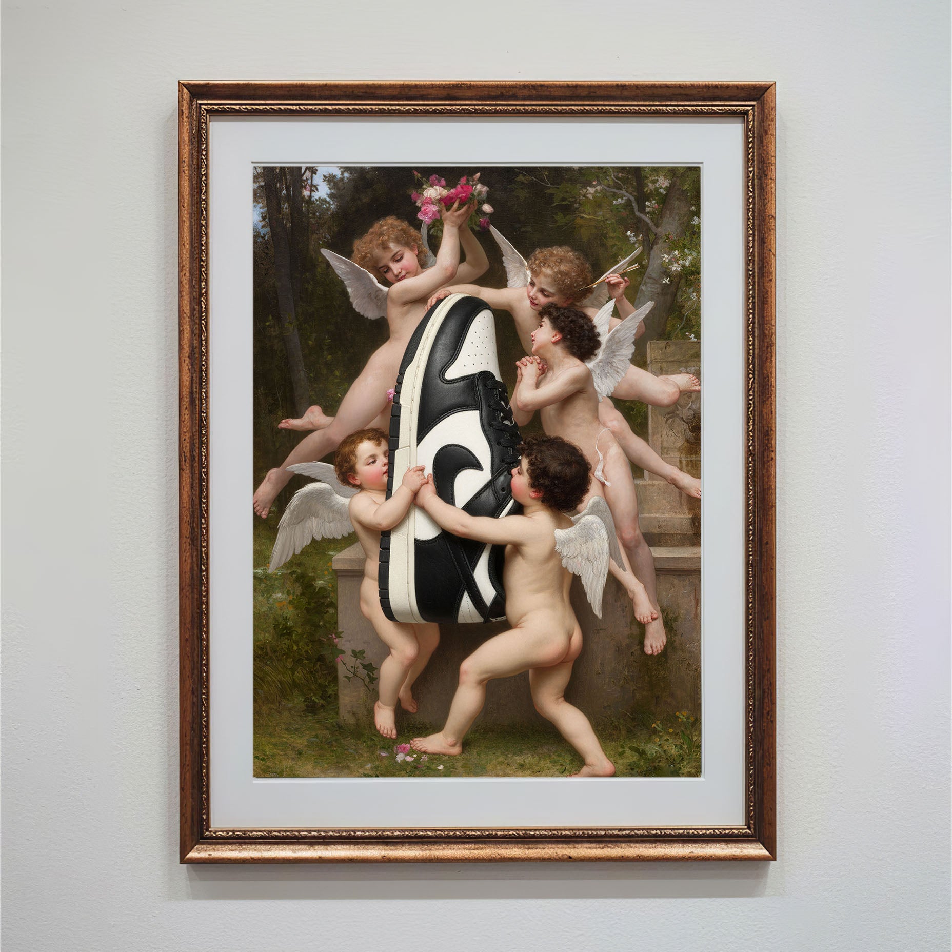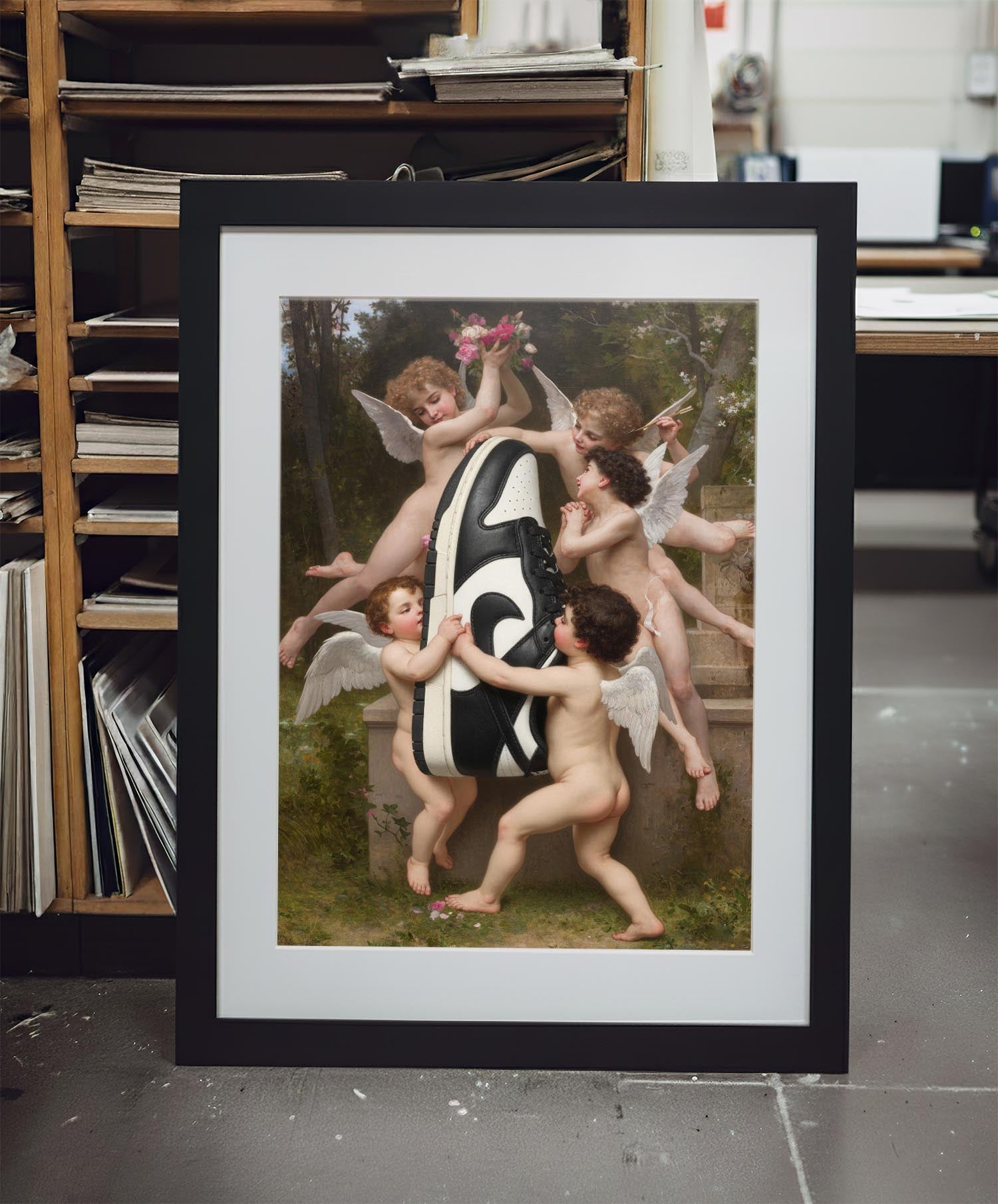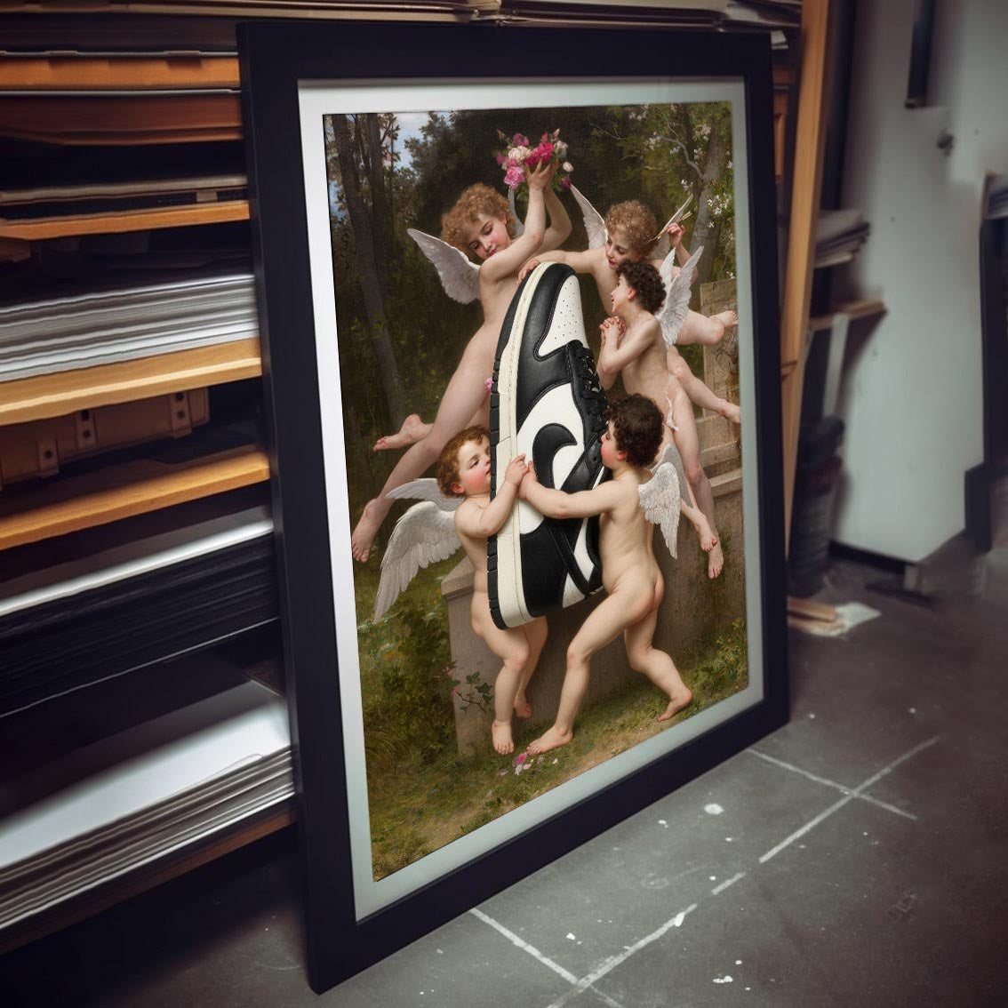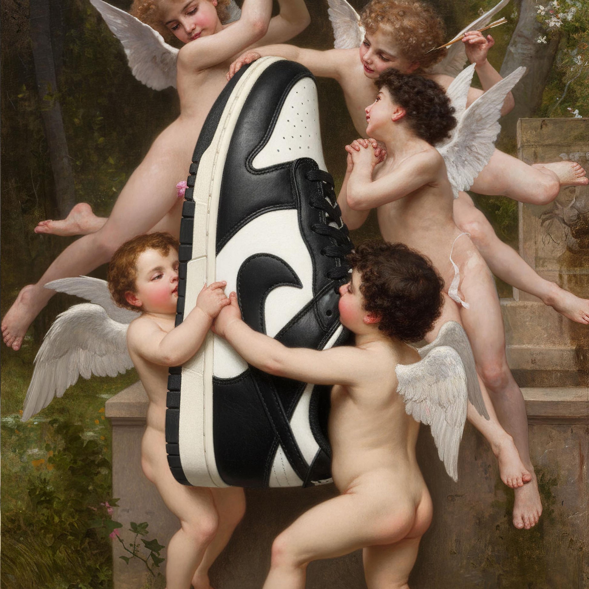 - Classic cherub painting is reinterpreted through a contemporary lens, transforming symbols of purity into worshippers of consumption. Bouguereau’s angels now adore an iconic sneaker, elevating the urban object of desire to the rank of a sacred relic.