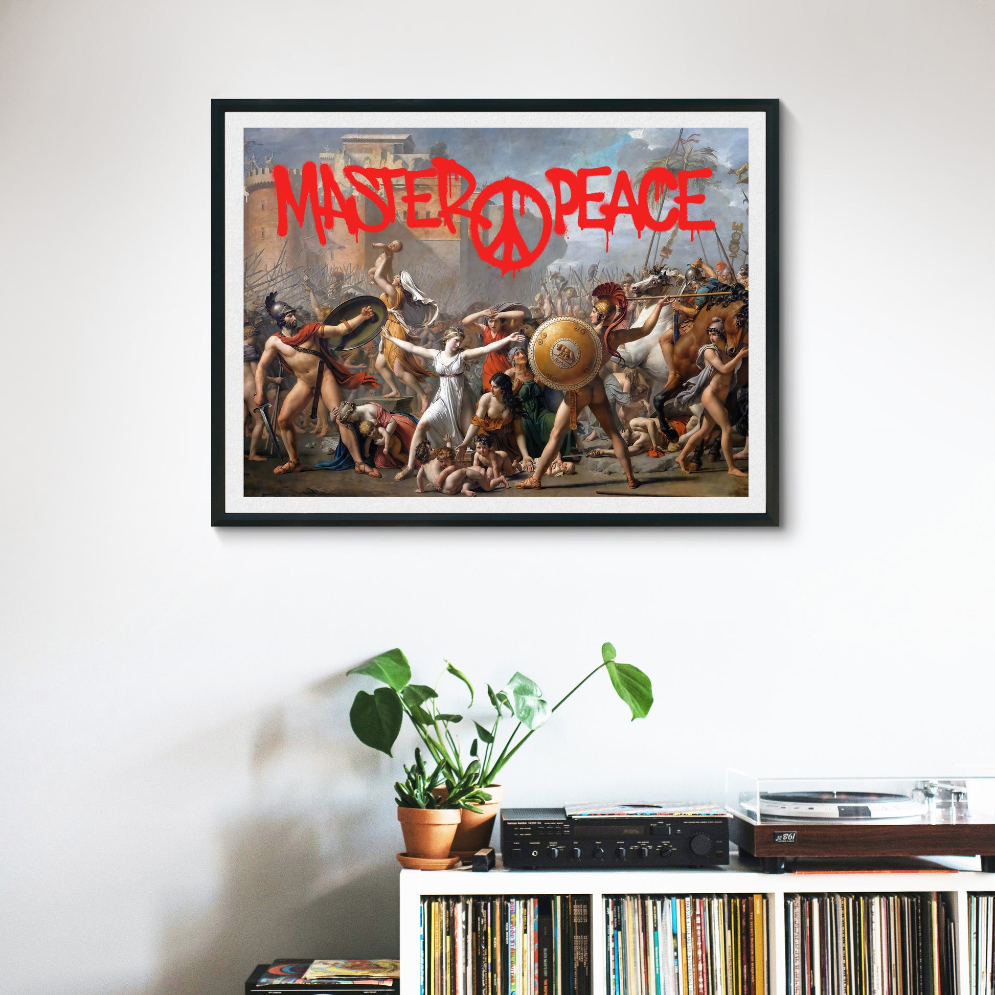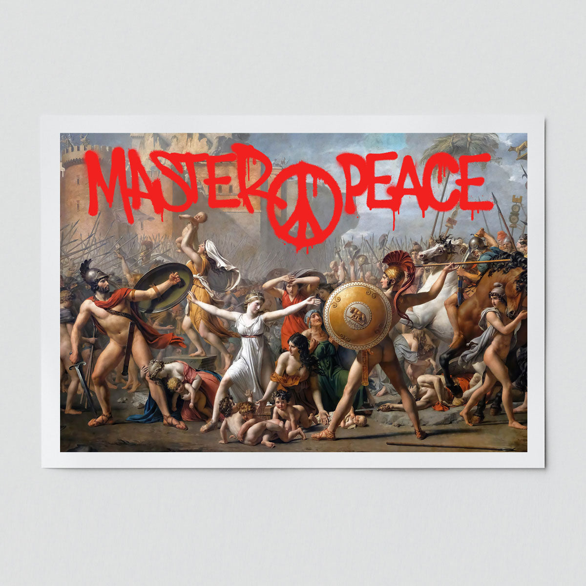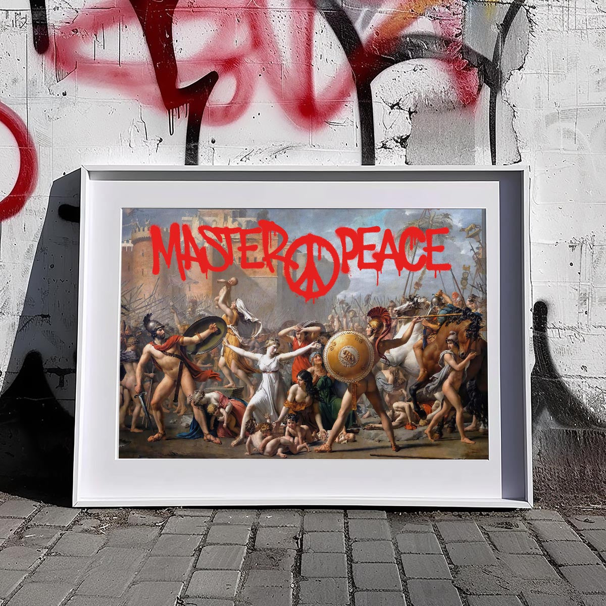 - "Masterpiece" is a bold reinvention of one of Jacques-Louis David's most celebrated paintings, adding a new context of advocacy and protest. In this artwork, contemporary graffiti is integrated into the environment of a classic oil painting, illustrating a scene that serves as an ode to peace and feminism. The combination of contrasting elements creates a powerful visual statement, highlighting the urgency of stopping conflicts and wars in the modern world. This innovative approach offers a new interpretation of the original work, transforming it into a symbol of change and social activism. "Masterpiece" challenges conventions and invites us to reflect on the role of art as an agent of change in contemporary society.