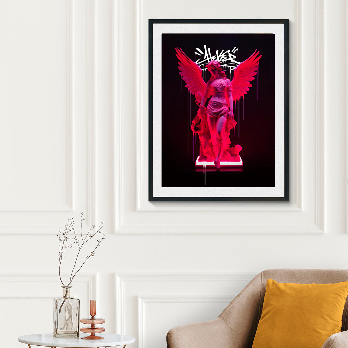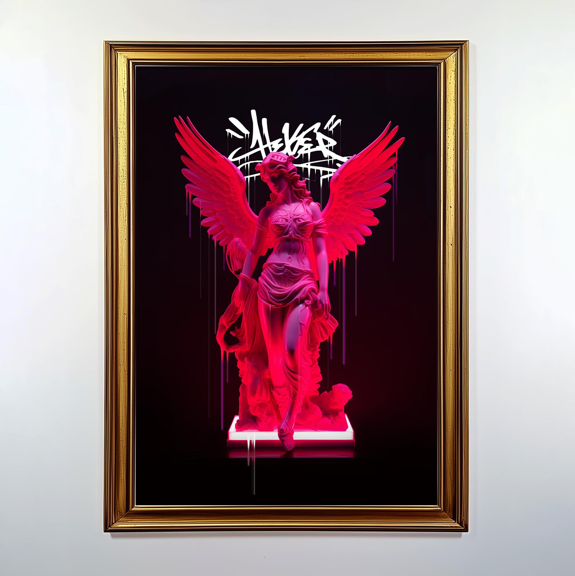 - "Neon Athena" is a piece from the "Vandal" series, where figures of classic Greek goddesses collide with urban art in a unique artistic union. With a distinctive touch, this work exudes an imposing style of beauty that challenges conventions. The majesty of Athena, the goddess of wisdom and war, is heightened by the vibrant energy of neon and elements of street art, creating an unexpected yet captivating fusion.