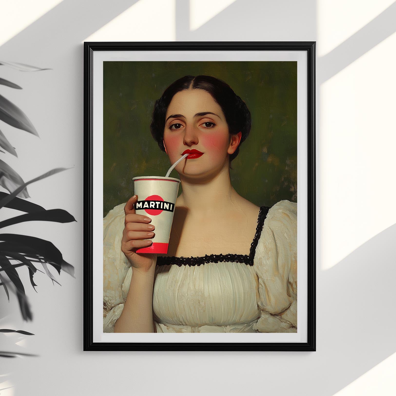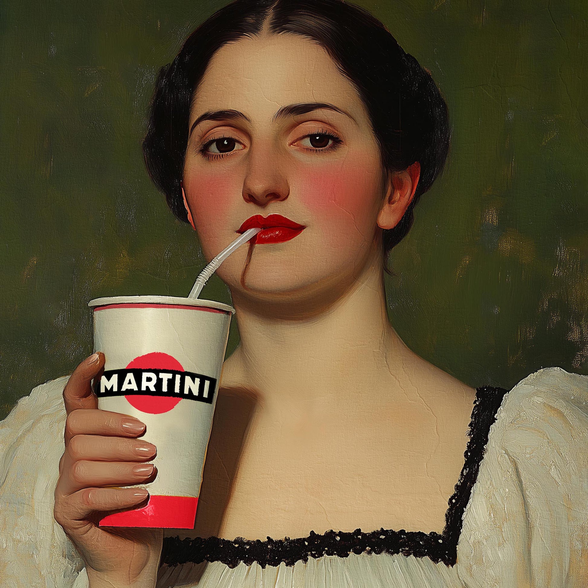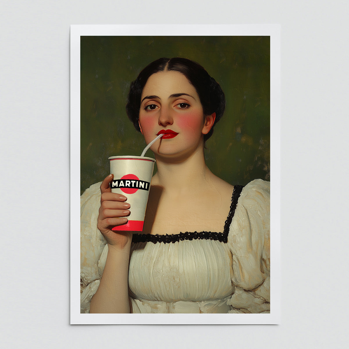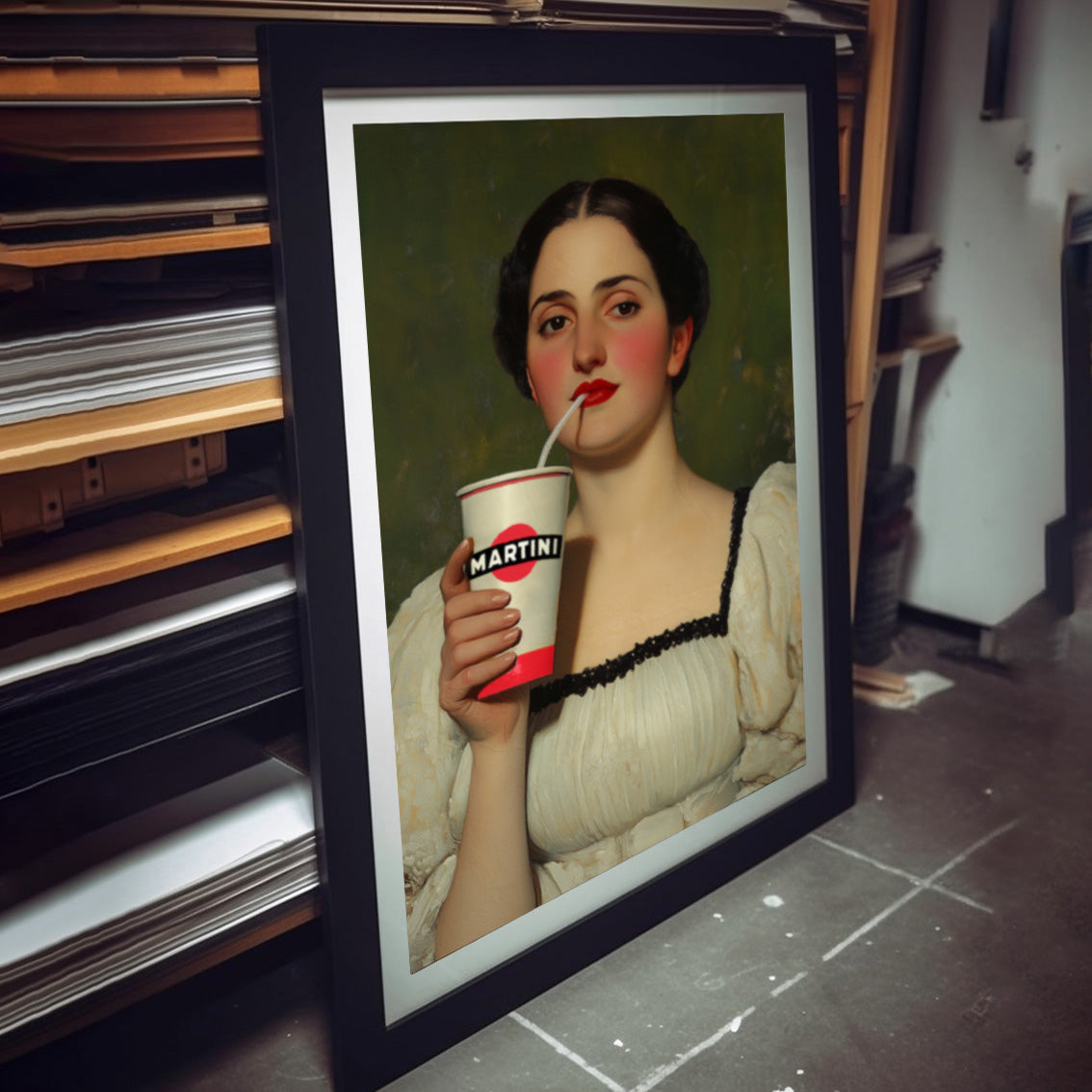 • She was ready for a royal ball, pearls polished, posture perfect, a true neoclassical icon frozen in elegance… until reality sips in. That “crystal goblet”? Just a greasy plastic cup from your favorite drive-thru. A cheeky tribute to timeless grace, fast-food disgrace, and the absurdity of it all.
