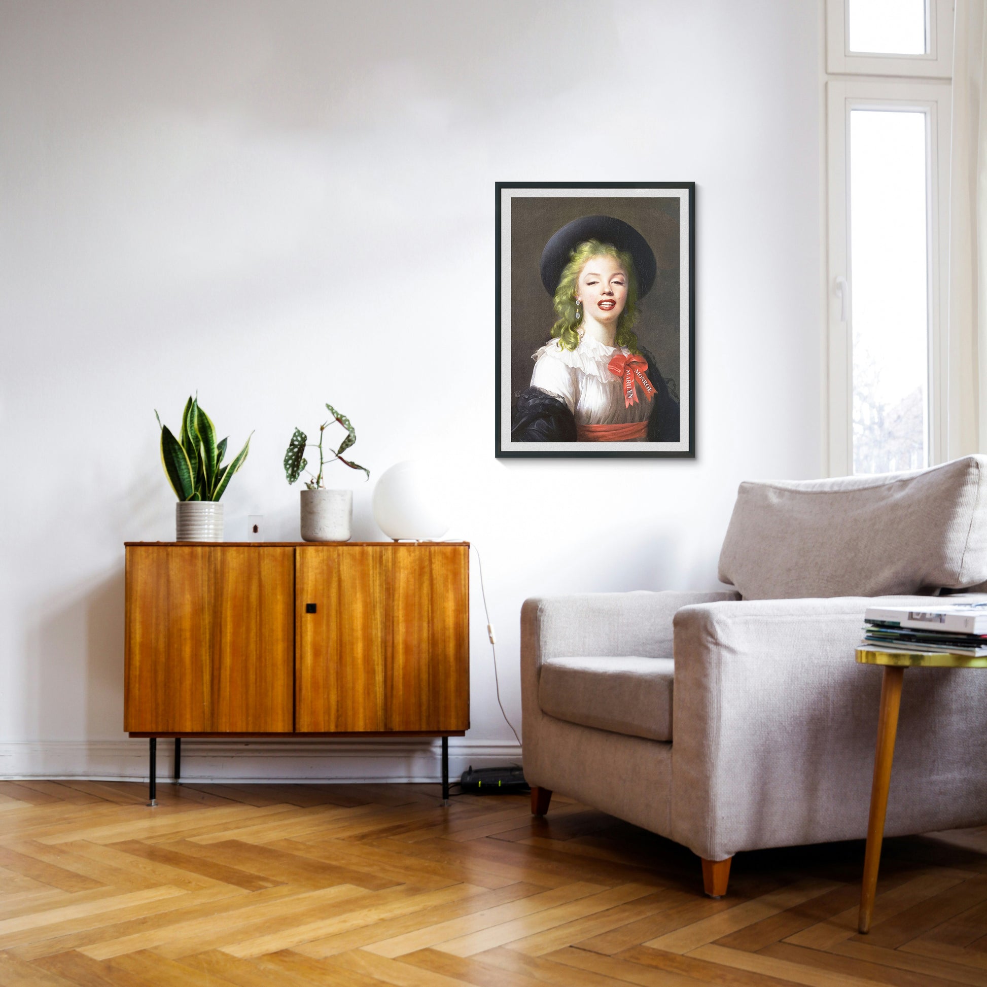 • "Vintage Marilyn" is a tribute to the iconic artist Marilyn Monroe, where she is mixing with a neoclassical portrait, creating a curious dikhotomy for a new neopop piece.