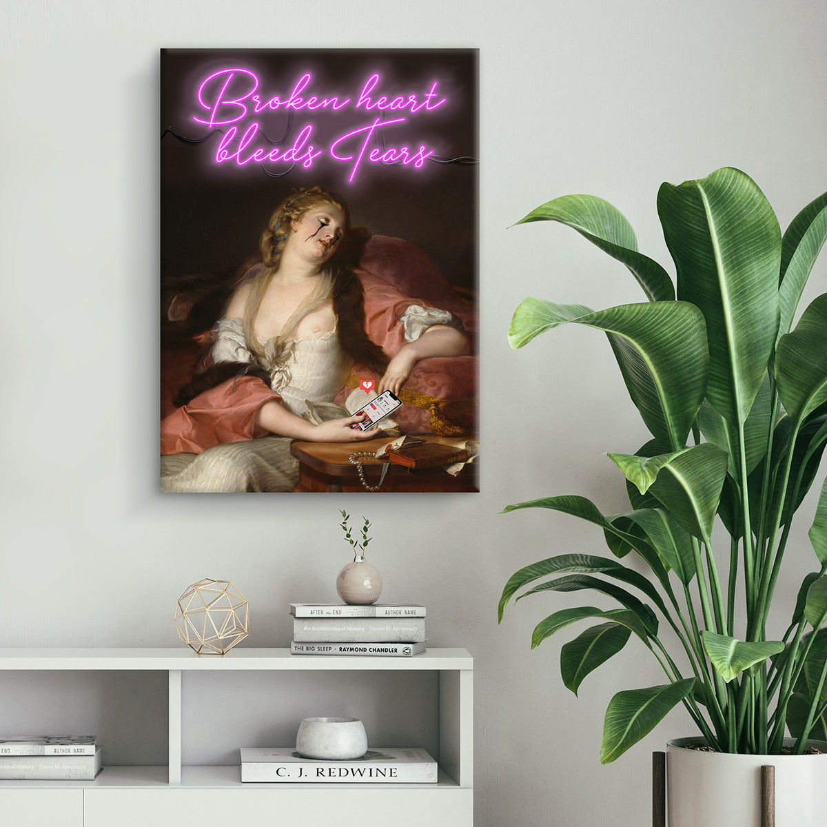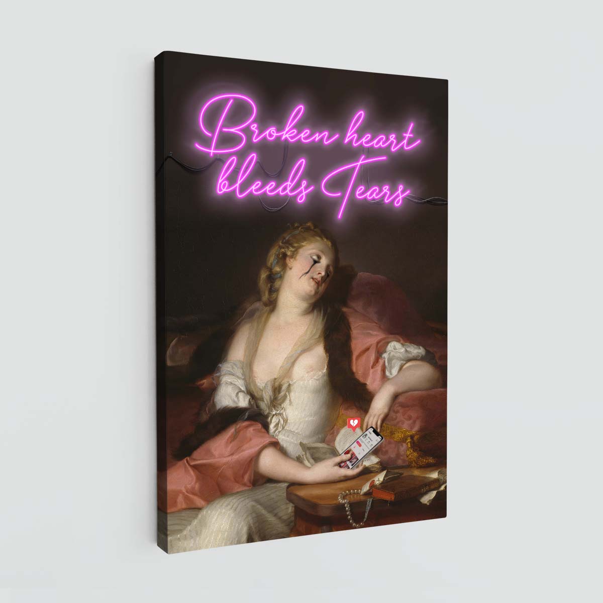 - "Broken Heart" is a fantastic collage that satirizes romantic relationships through social media. This artwork offers an ironic critique of contemporary society's behaviors, all mixed with a Renaissance style rescued from iconic paintings of the era. In this piece, classical elements intertwine with contemporary symbols to illustrate the fragility and complexity of relationships in the digital age.