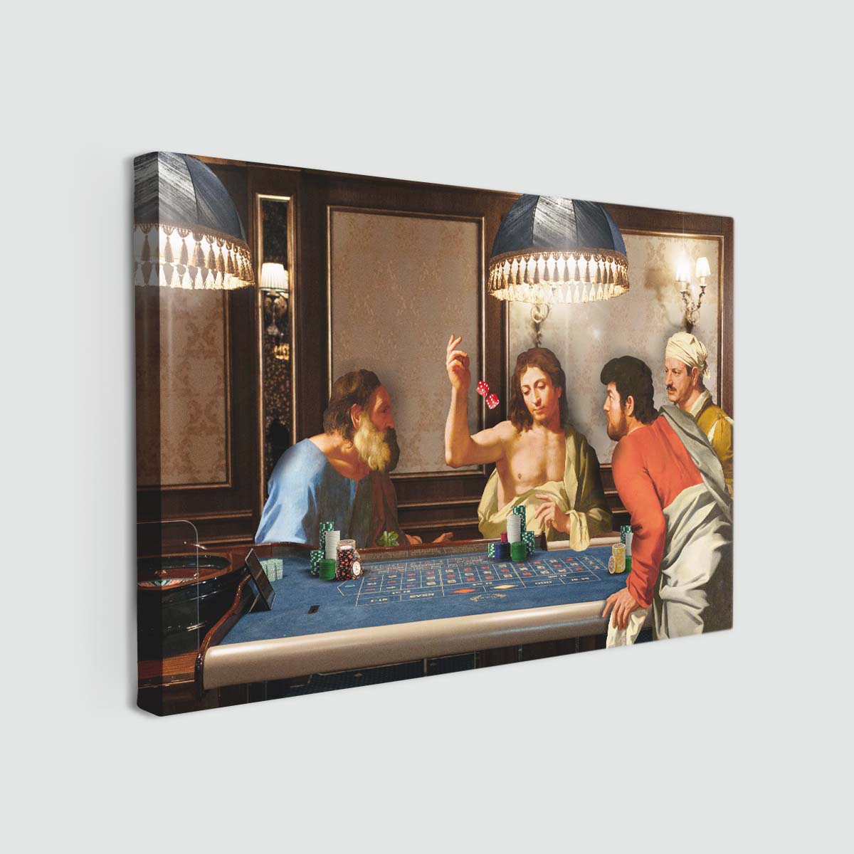- "Casino Gang" is a clever parody that uses collage technique to transform typical figures from old paintings into poker players and casino characters. This artwork merges the world of gambling and casinos with classical art, adding a mischievous and rebellious touch to catholic figures taken from Renaissance paintings. It's a piece full of humor and creativity that challenges artistic and social conventions.