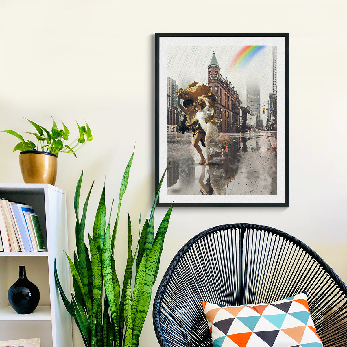 • "Center of the Storm" is a fascinating reimagining that transports the majesty of Pierre-Auguste Cot's oil painting to a contemporary urban setting. Inspired by neoclassical painting, this piece merges elements with collage technique to create a striking and evocative scene.