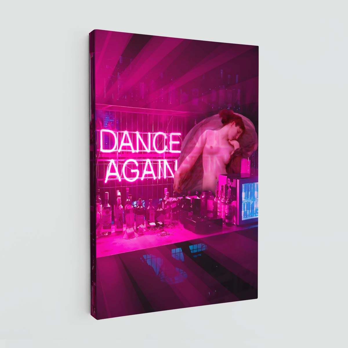 - "Dance again" captures the essence of a female figure typical of neoclassical painting and transports it to a nighttime disco club environment. This piece creatively fuses the elegance and grace of the figure with the energy and vibrant atmosphere of the dance floor, creating a scene that invites the viewer to imagine the rhythm and music surrounding this enigmatic woman.