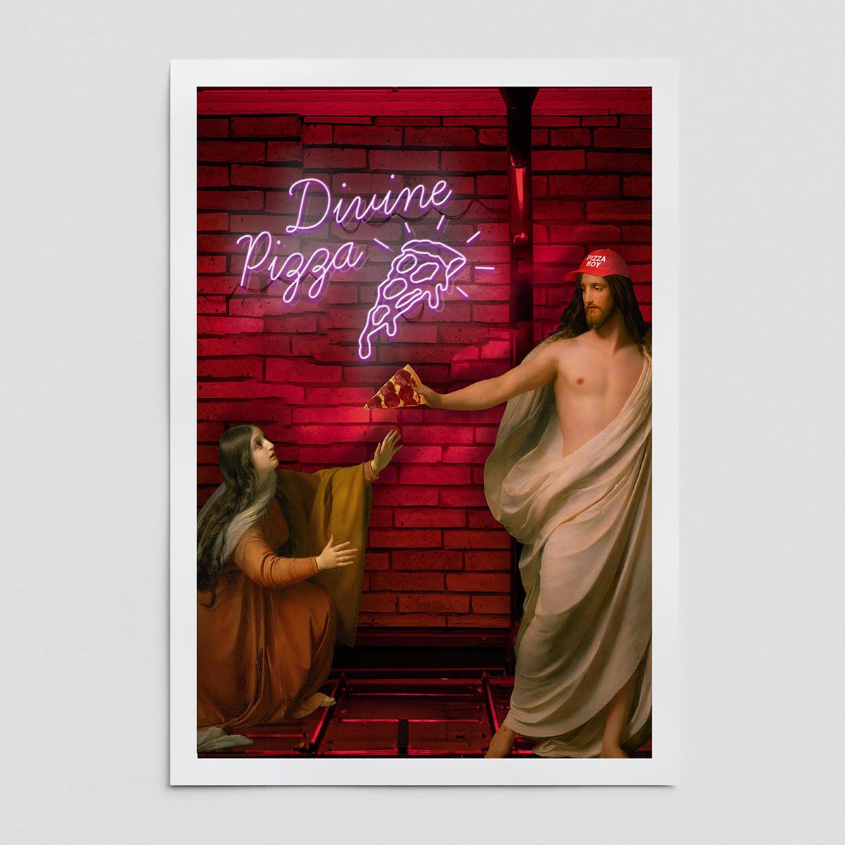 - "Divine Pizza" by Dikhotomy reimagines Jesus Christ and Mary Magdalene in a pop and surreal style through collage. Taken from Renaissance artworks, these figures now share a delicious Neapolitan pizza, blending the sacred with the everyday. With a humorous twist and elements of meme culture, this piece is a playful nod for pizza lovers and fans of reinterpreted classical art.