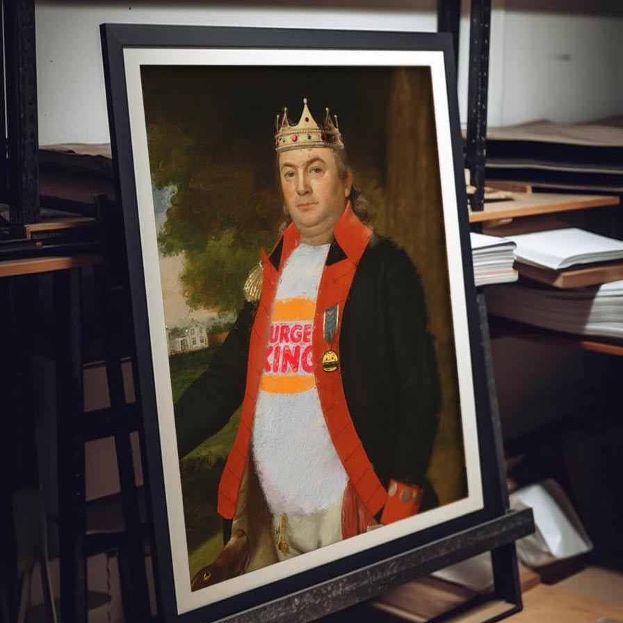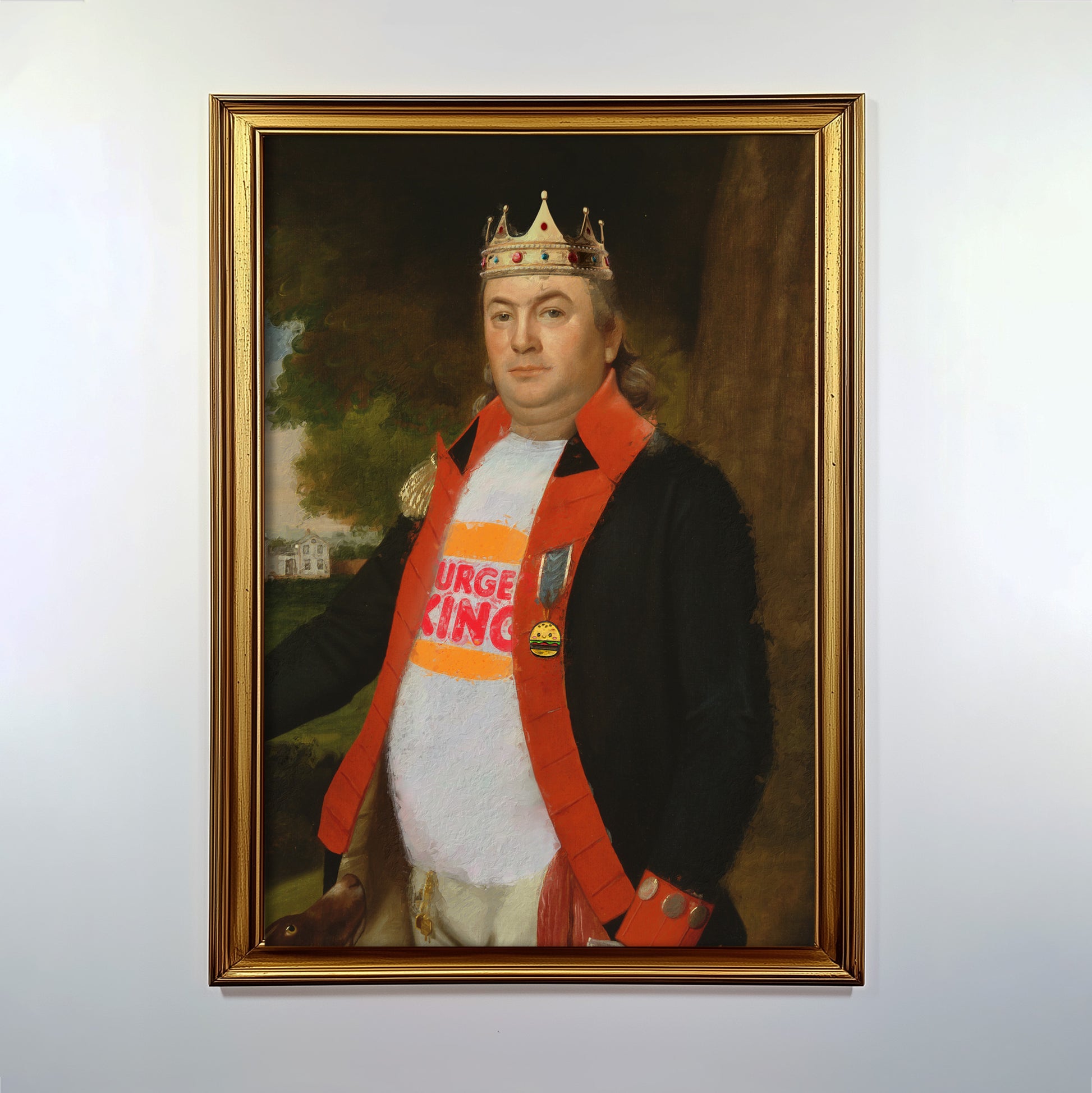 - "Fast Food King" is a brutal and surrealistic reinterpretation of a portrait painting of a royal figure, transformed into an ironic representation that humorously invites reflection on contemporary eating habits and the impact of fast food on society. It challenges traditional aesthetic conventions while delivering a message with a touch of humor.