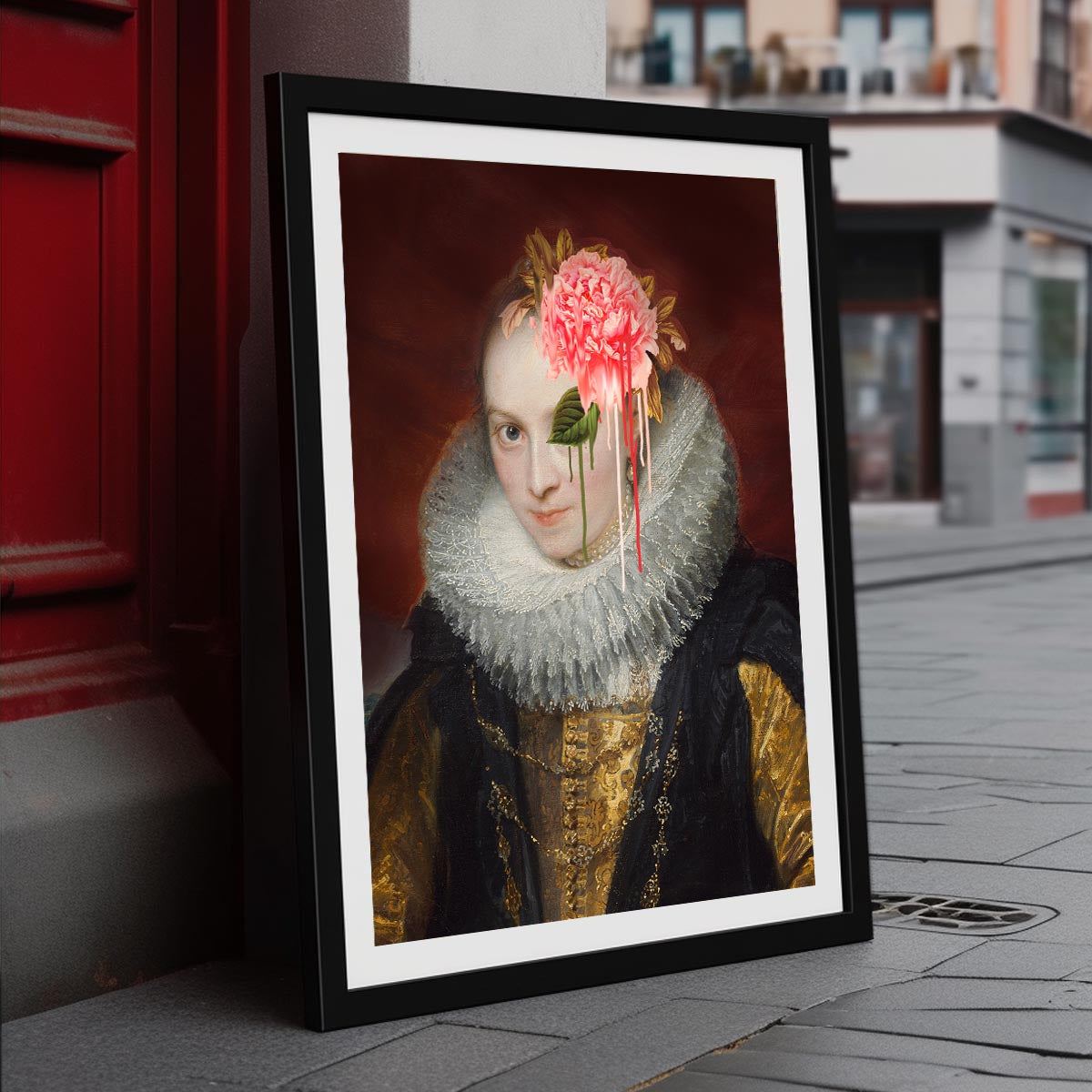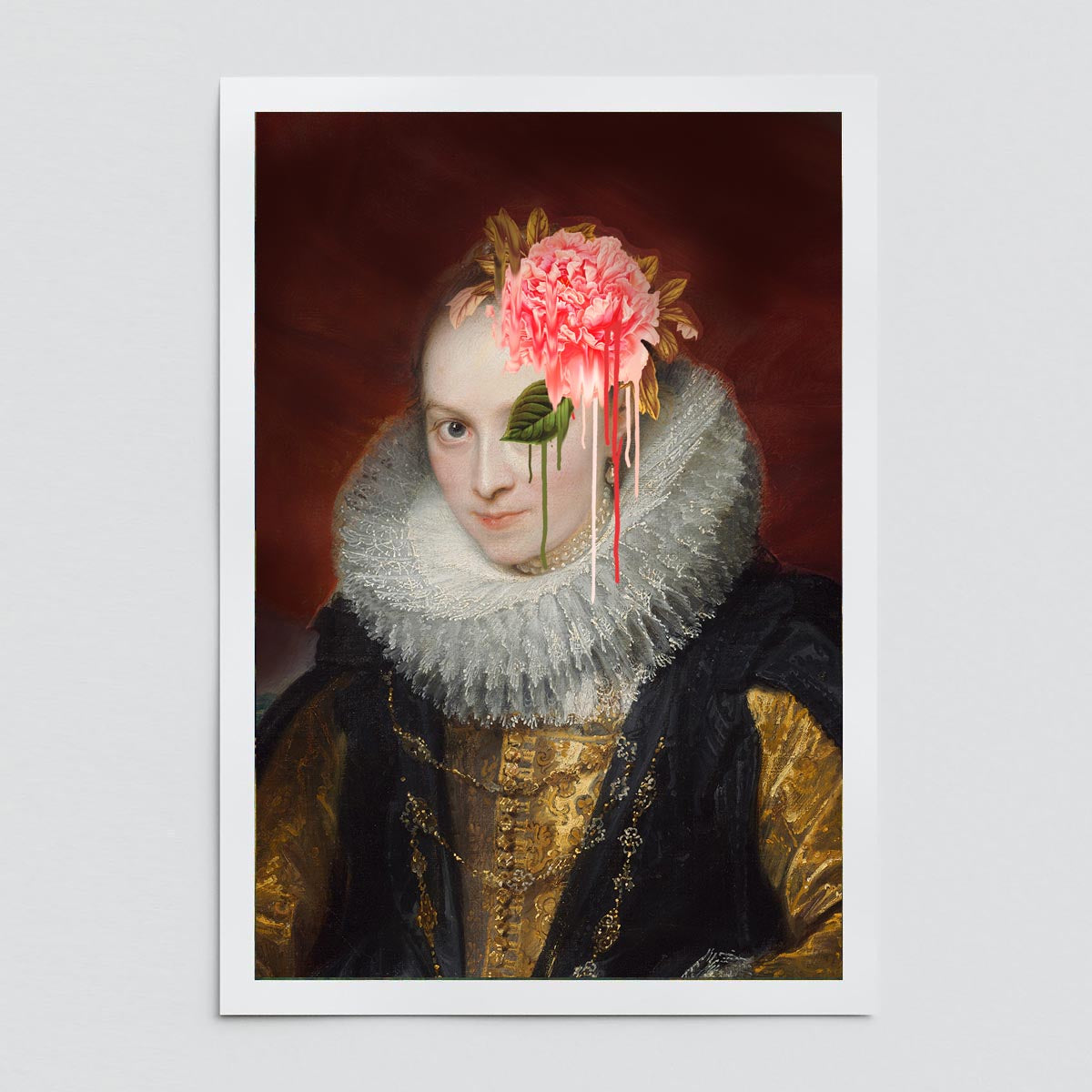 - This surreal collage merges the beauty of the Baroque portrait with the most pop digital transformation. The suggestive gaze of the female protagonist is transformed as a floral motif digitally dissolves over her face. This piece combines classical art with contemporary aesthetics, inviting the viewer to contemplate the interaction between the old and the new, fragility and permanence.