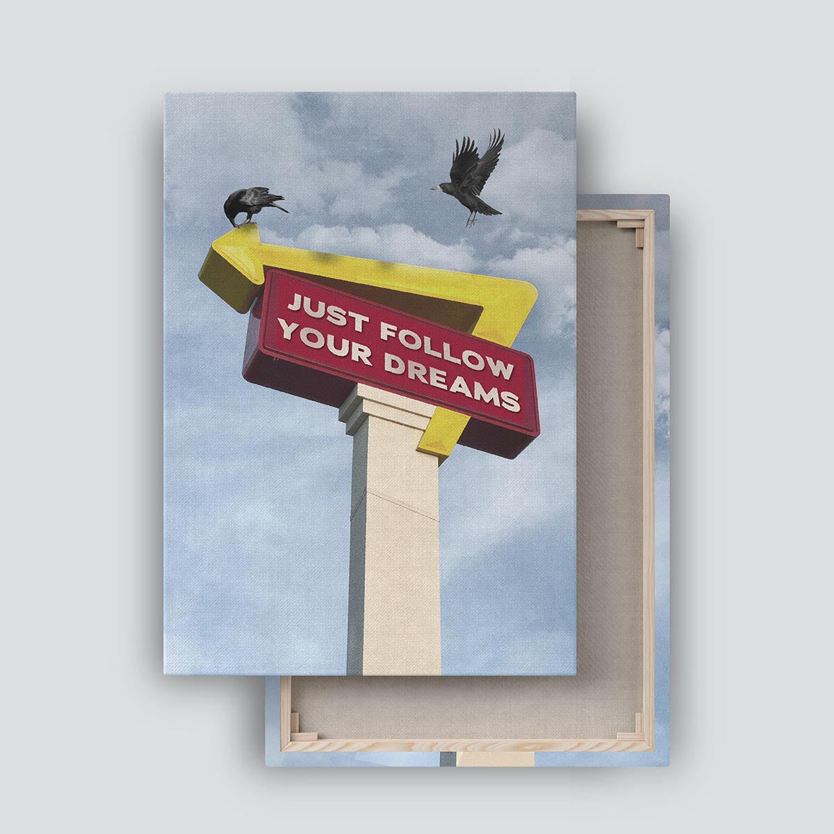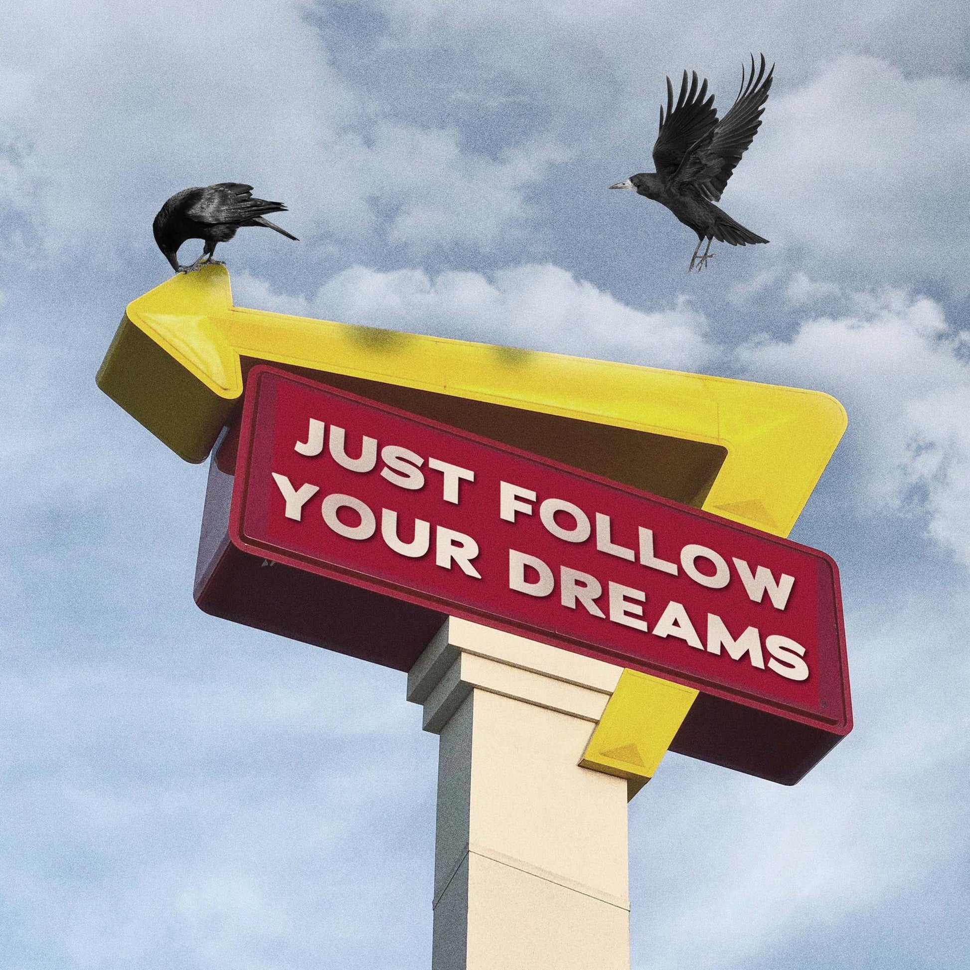 - "Follow Your Dreams" is a curious digital illustration that evokes the aesthetics of vintage American signs and posters. Set in a desolate and almost apocalyptic landscape, it invites the viewer to reflect on the purposes of human life. The phrase "Follow Your Dreams" sets the stage for a philosophical exploration, reminding us of the importance of pursuing our dreams even in the most difficult and challenging times.