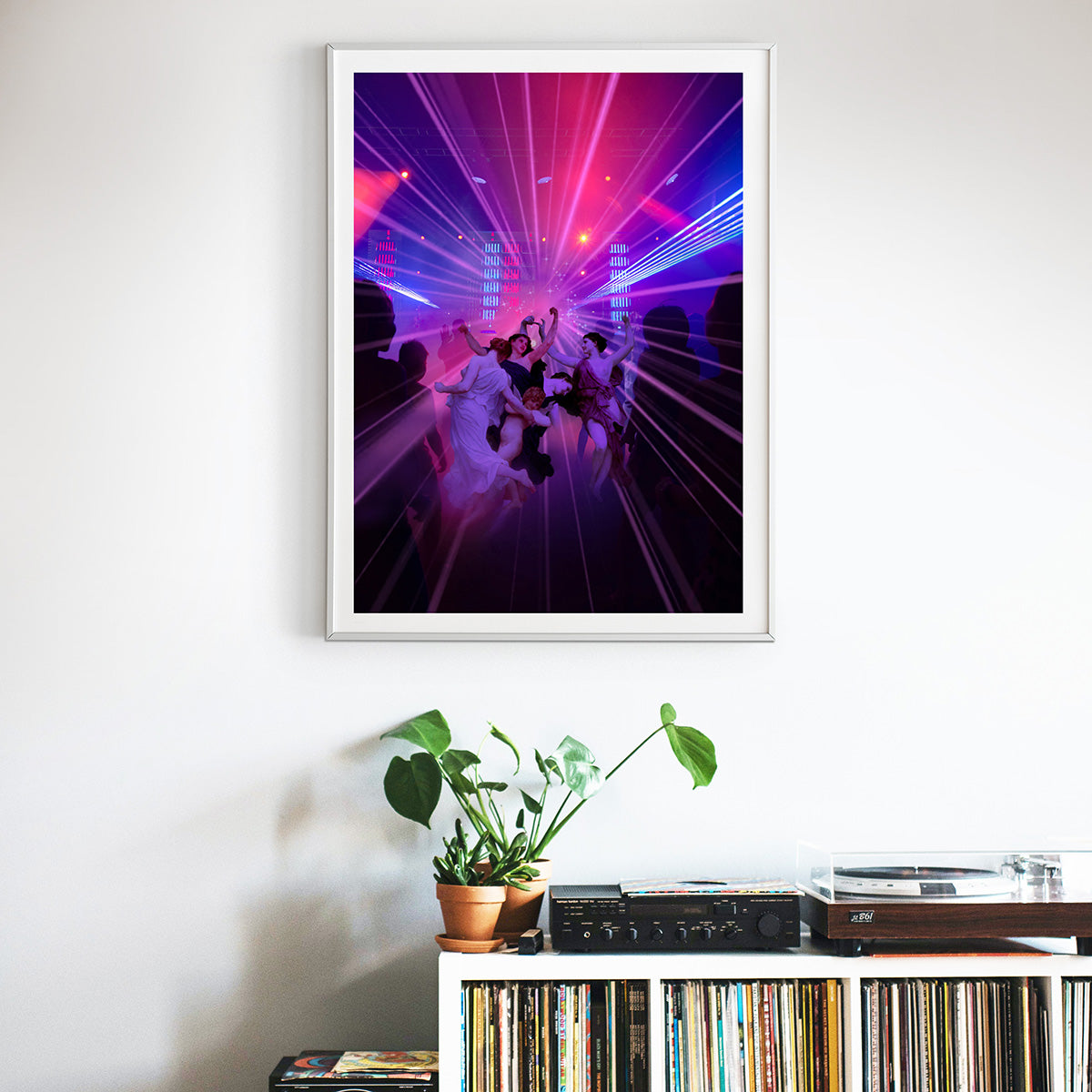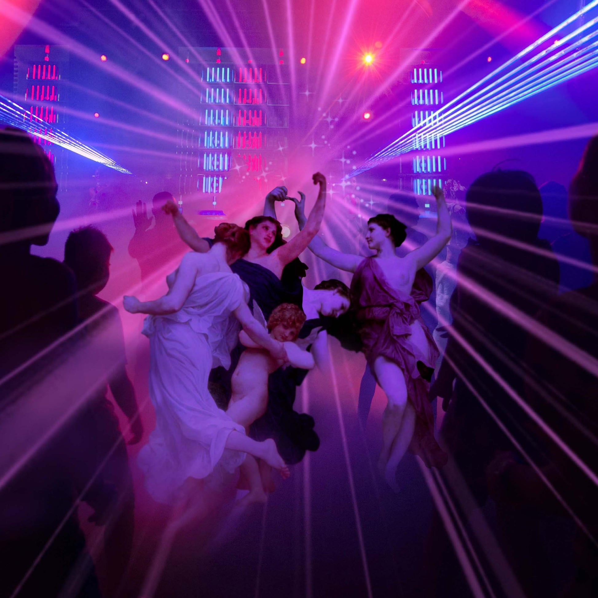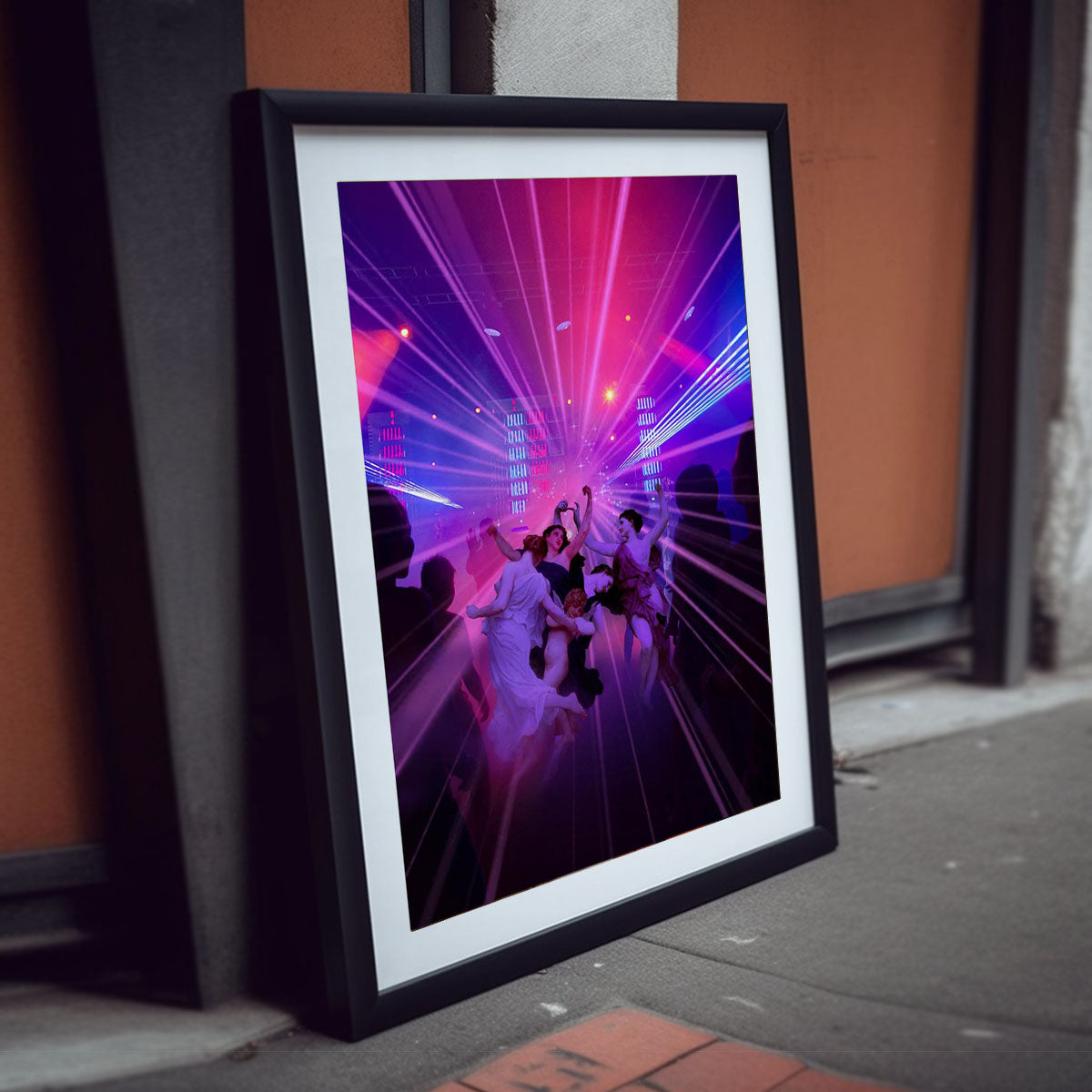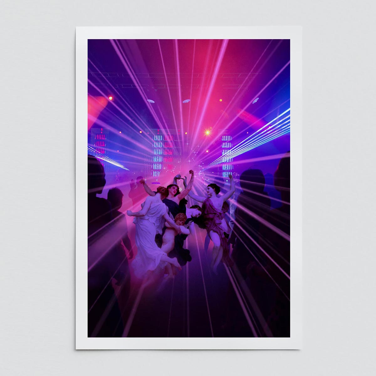 - "This digital collage celebrates the magical nights when a group of girls comes together to dance away their worries. Nymphs taken from neoclassical paintings dive into a vibrant modern nightclub setting, filled with lights and neon. The blend of old and new captures the euphoria and freedom of the dance floor, creating a piece that radiates with energy and unbridled joy."Decorate and personalize your favorite wall with an original fine art print by Dikhotomy.