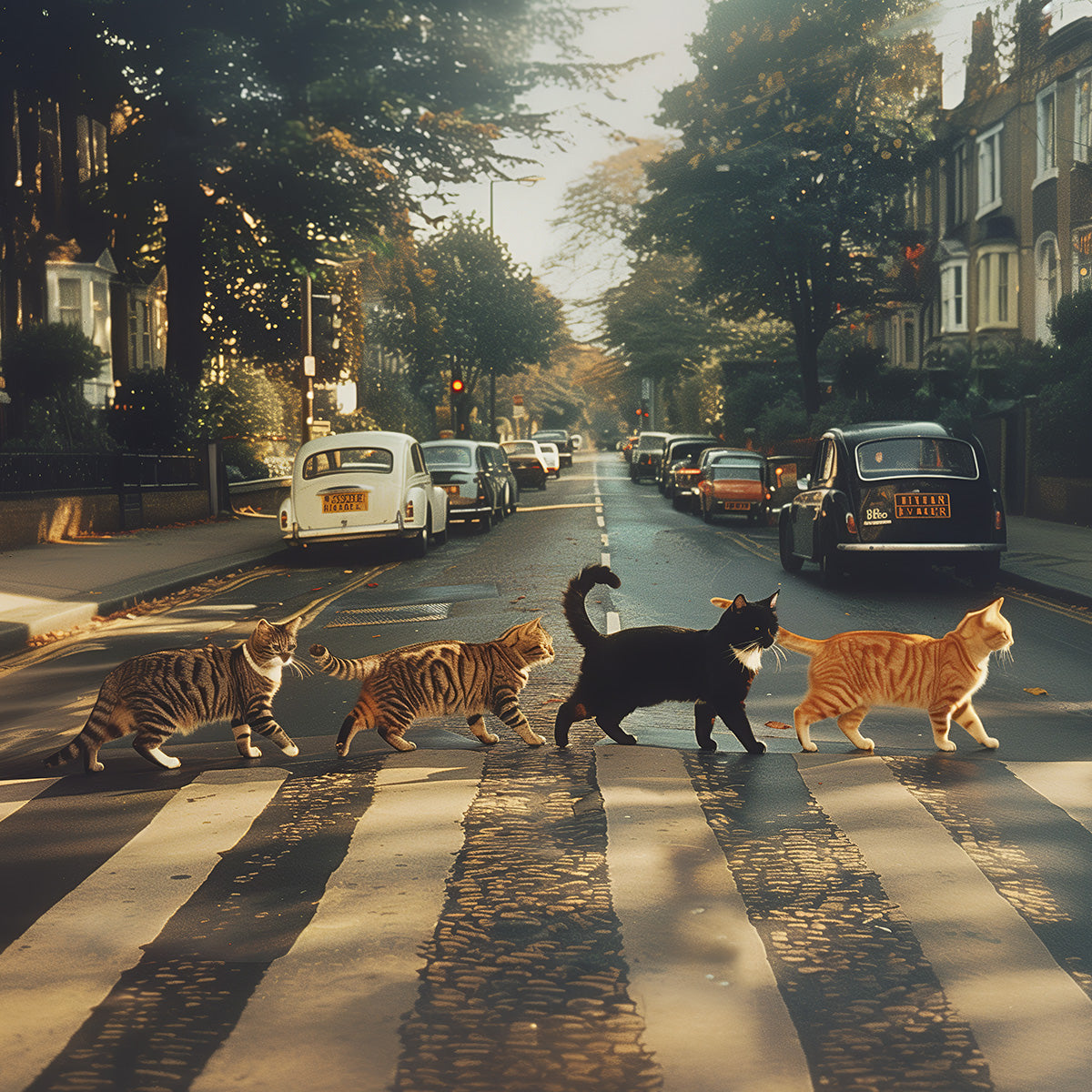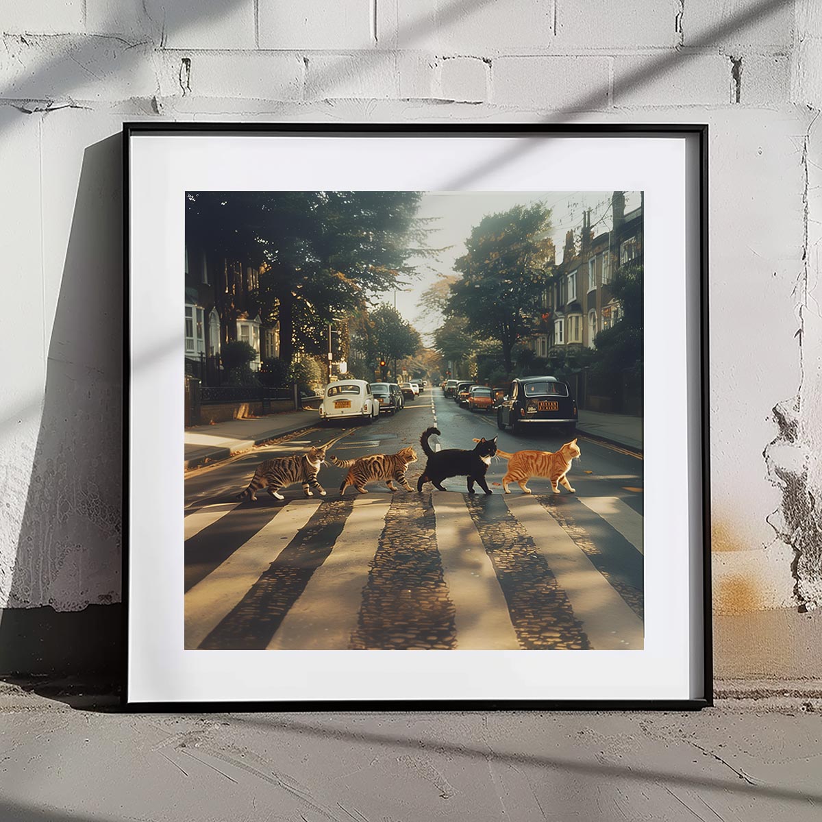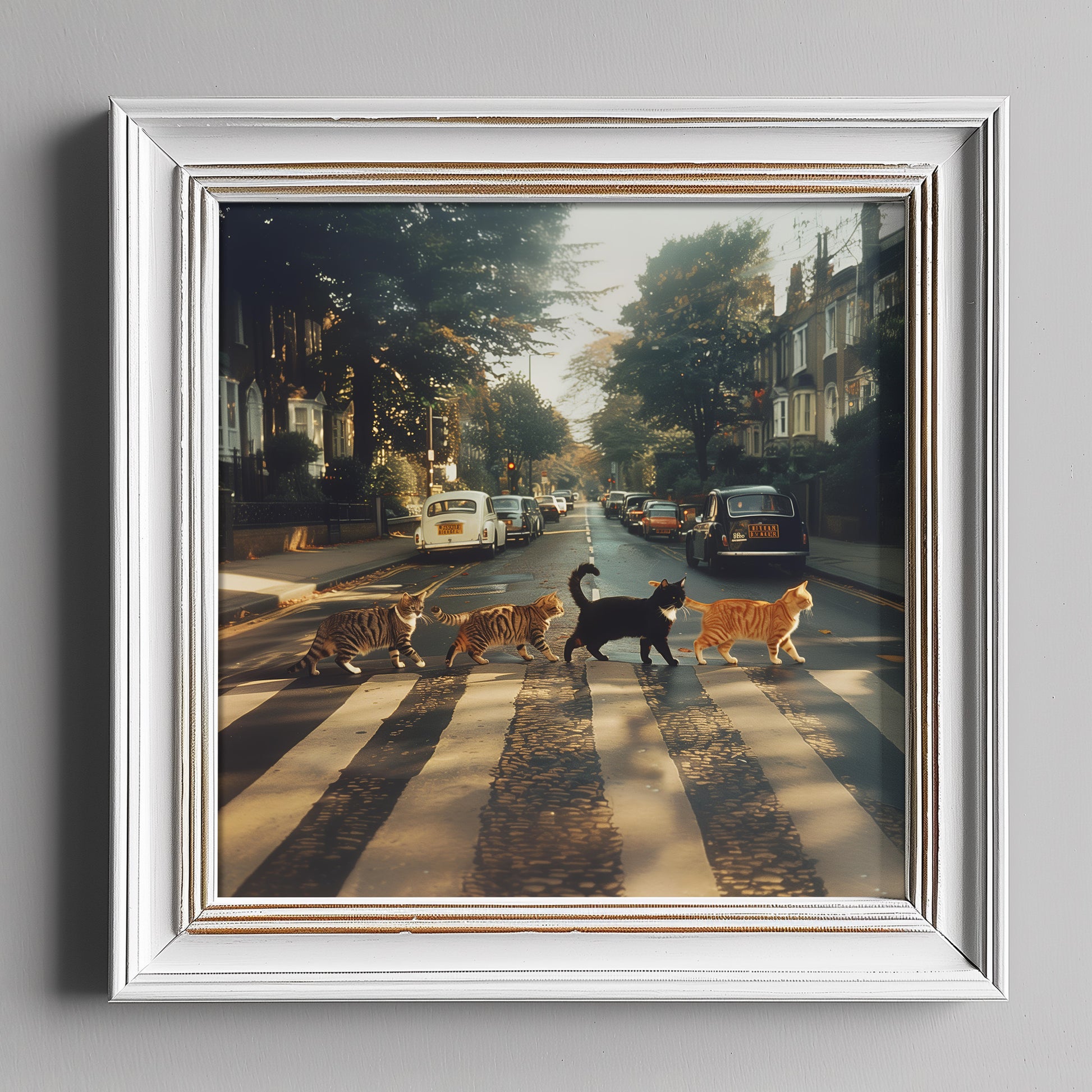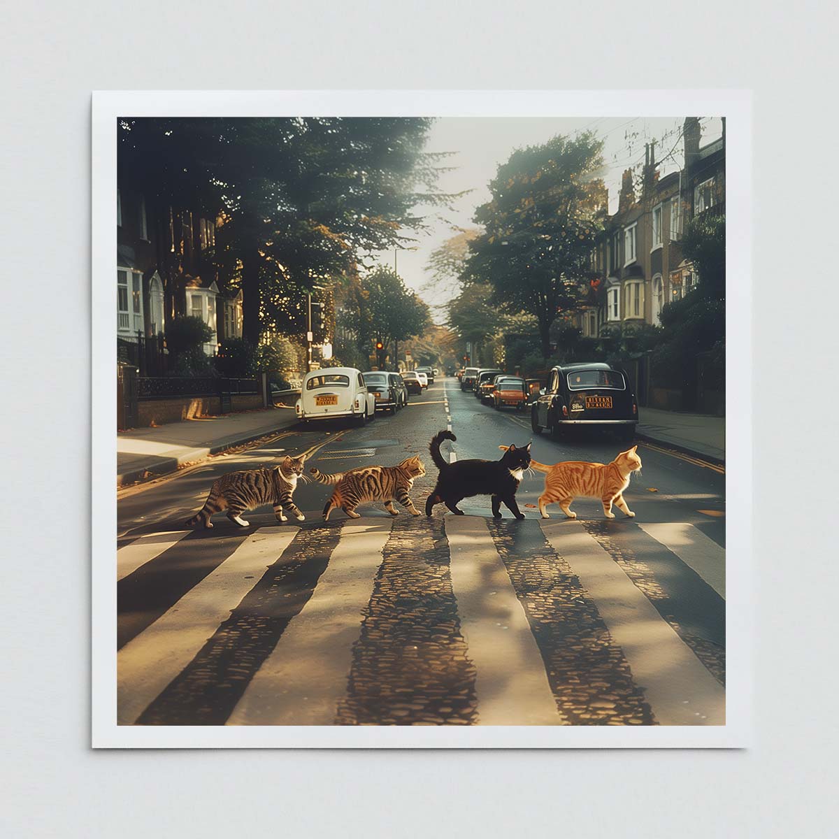 - Is it them or their pets? This clever and amusing digital artwork brings together one of the most iconic rock album covers in music history in a perfect mash-up for cat lovers. By replacing the legendary band members with adorable felines, the artwork plays with the idea that our cats are the true rock stars of our lives.