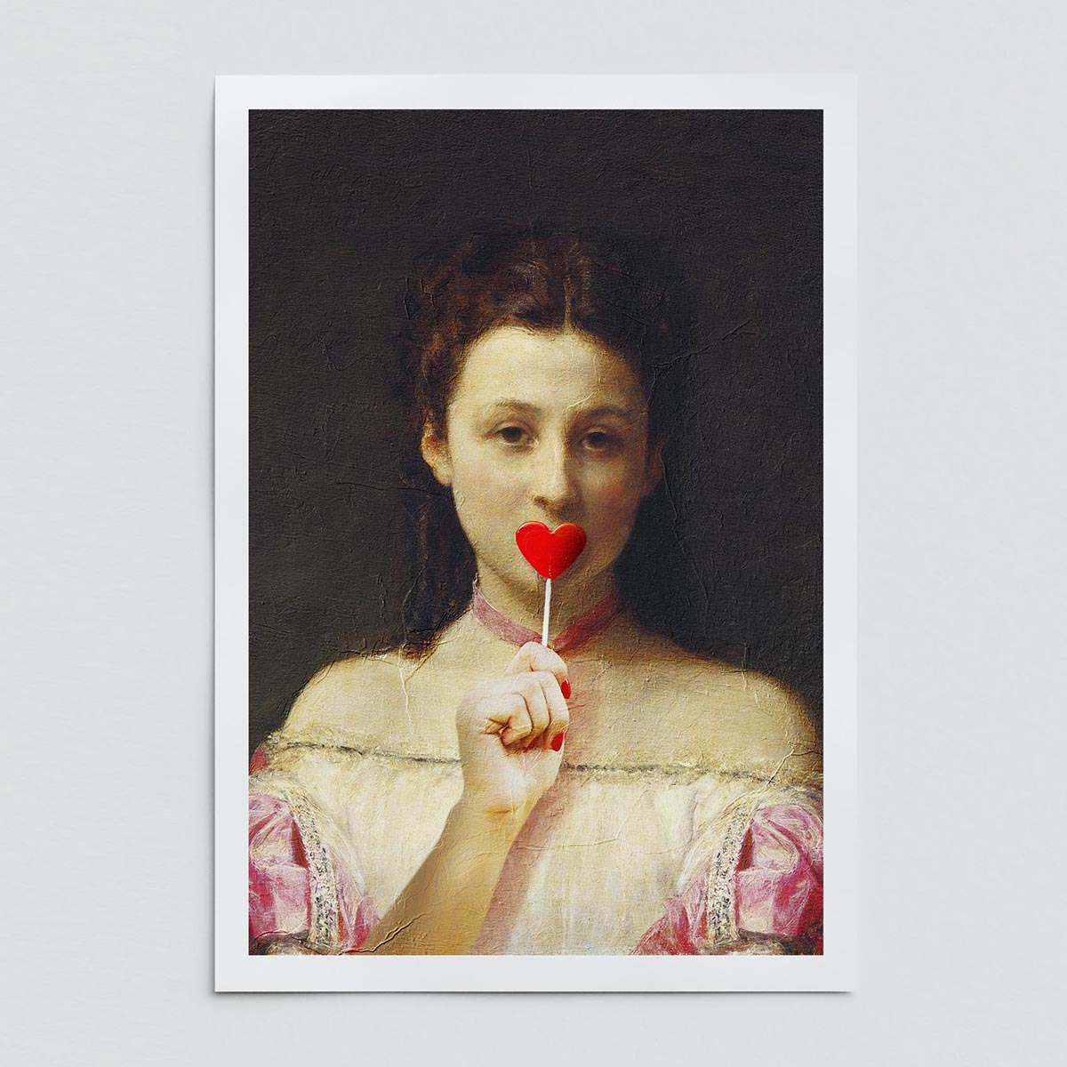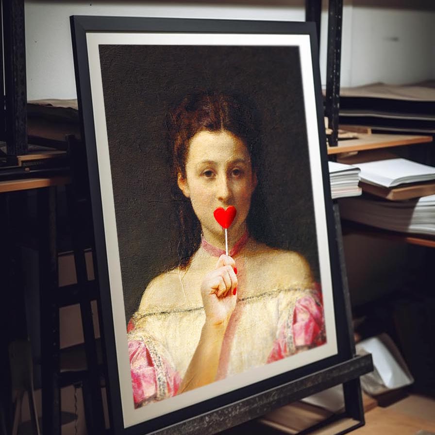 • "Lollipop Girl" is a captivating piece that evokes the aesthetic of a neoclassical portrait, where a young girl playfully interacts with a lollipop. This piece is achieved through a clever blend of digital collage techniques, creating a surreal and fun composition. Classic beauty merges with contemporary elements charmingly, inviting the viewer to explore the duality between the traditional and the modern.