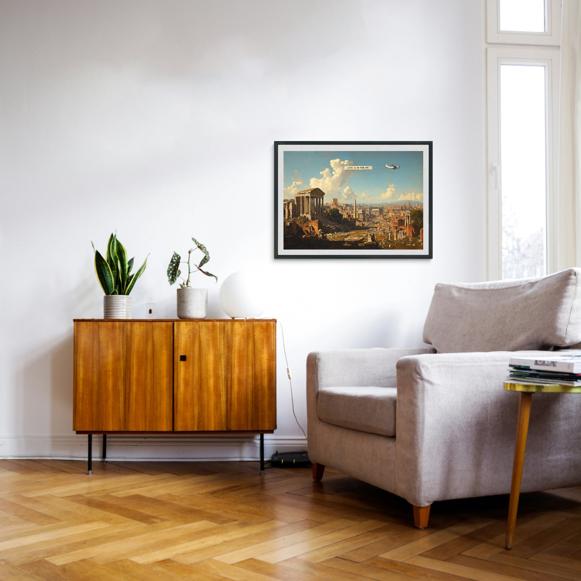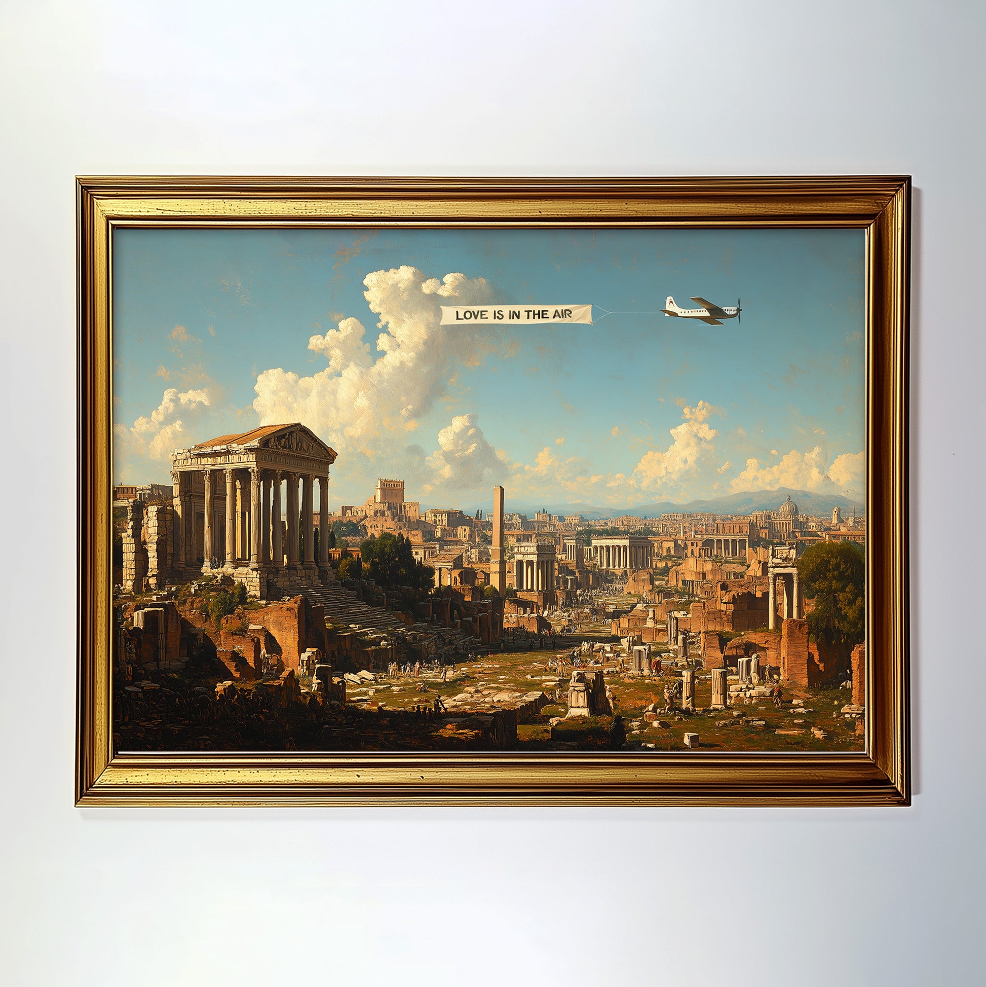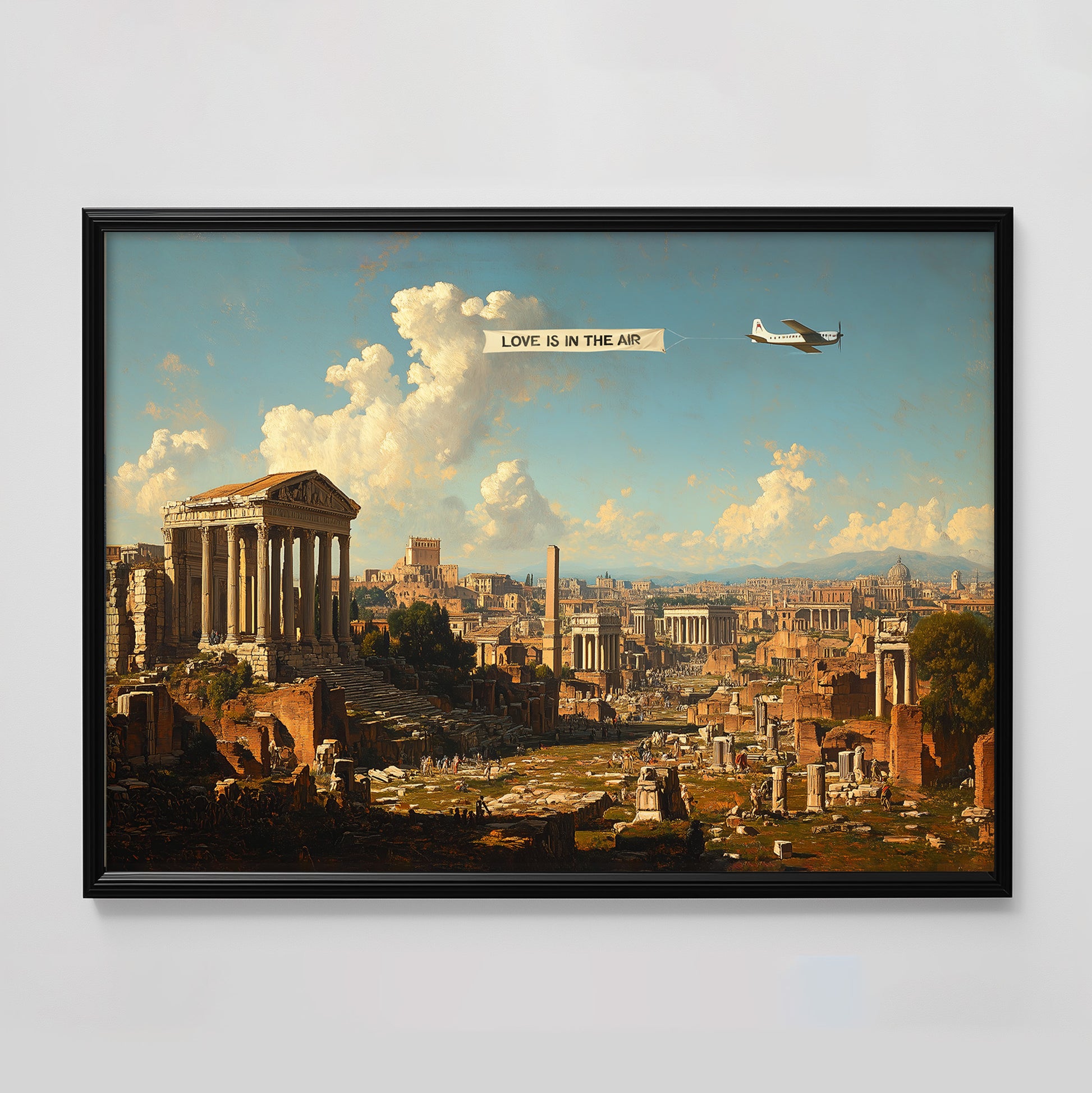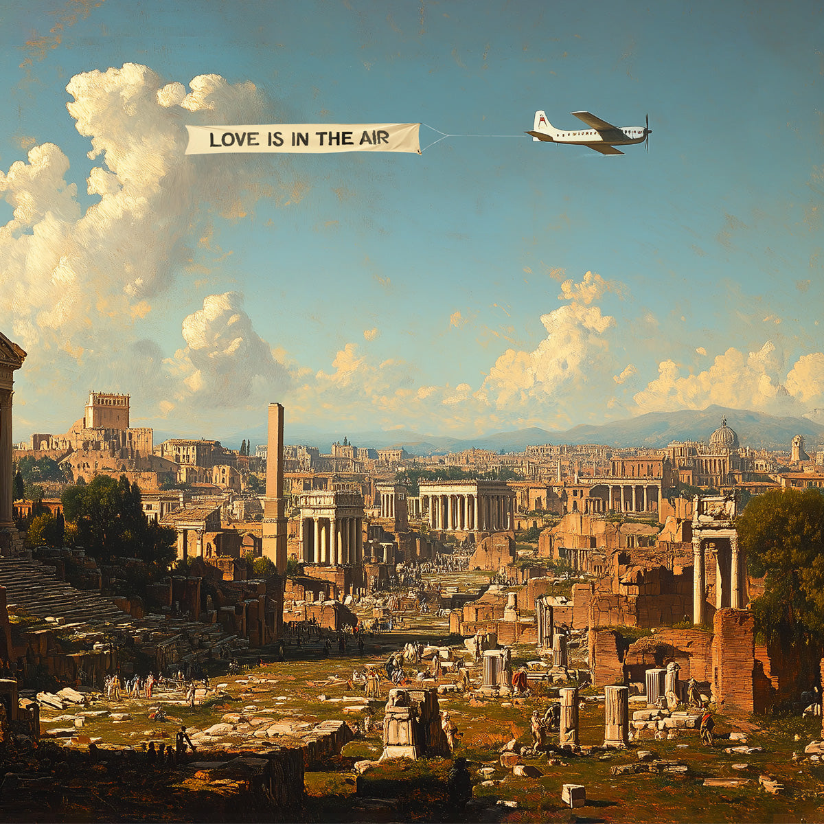 • The Roman Forum, once the center of power and glory, is now overshadowed by a small plane carrying a devastating message. Maybe, somewhere in history, empires fell because they forgot that love, in the end, is the only kingdom that endures.