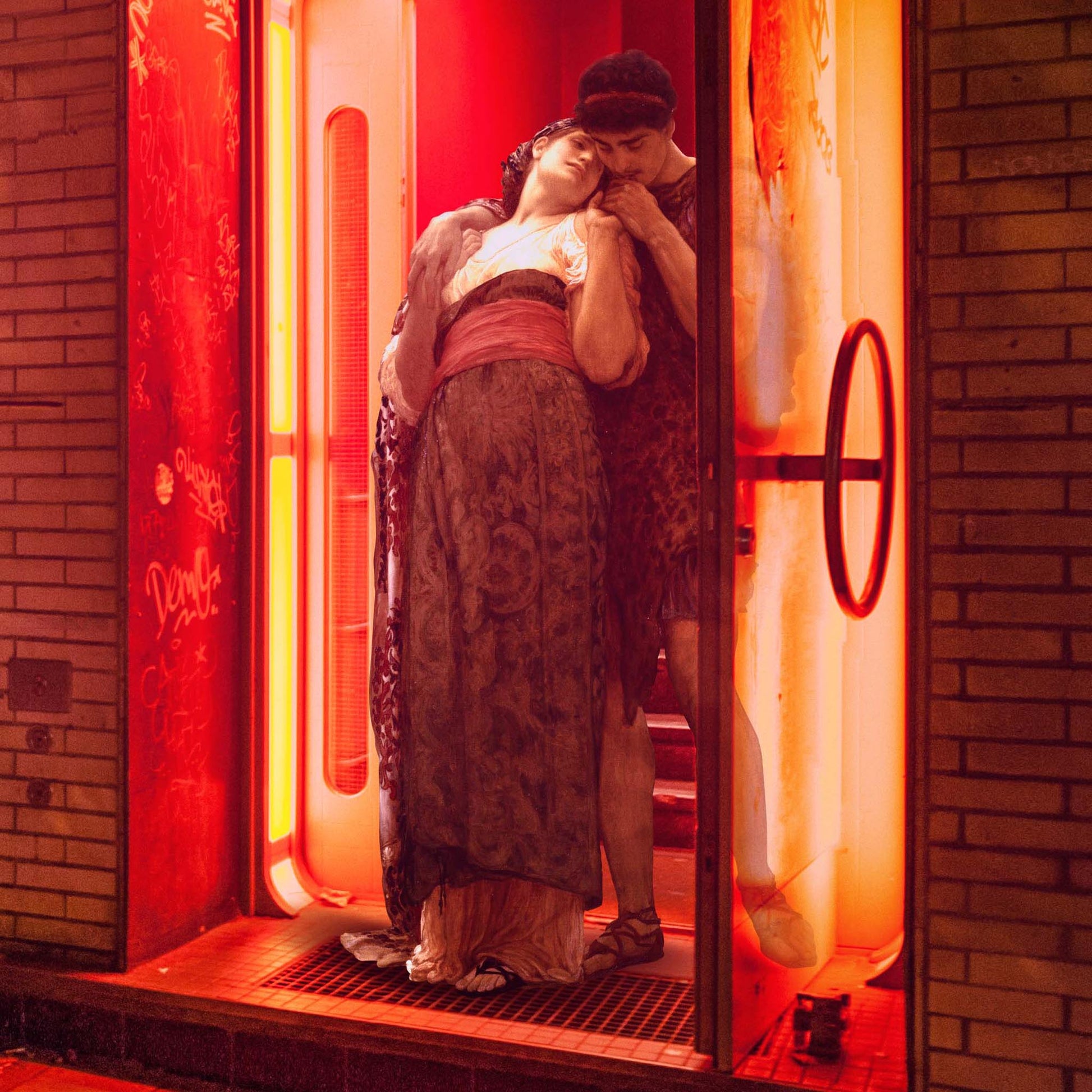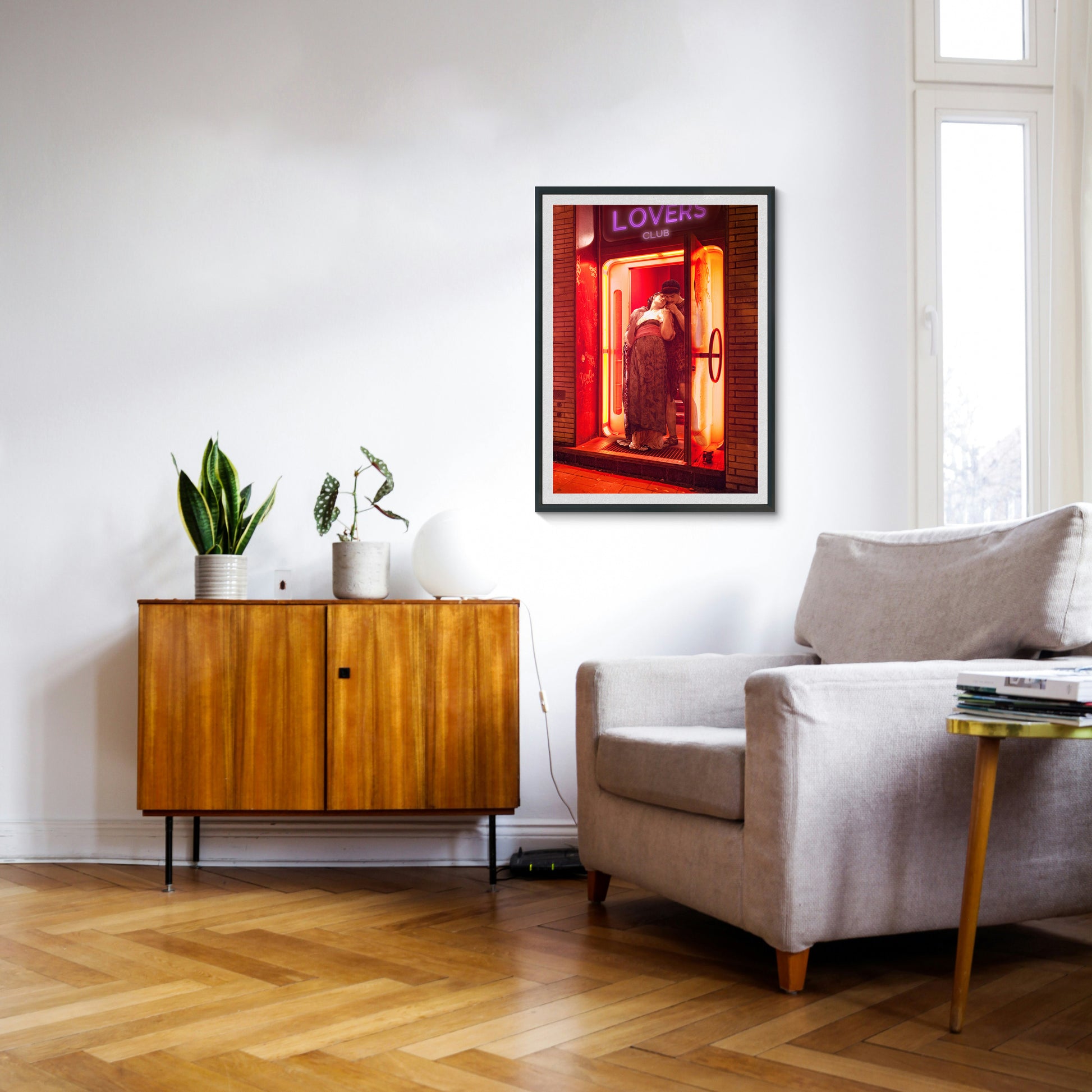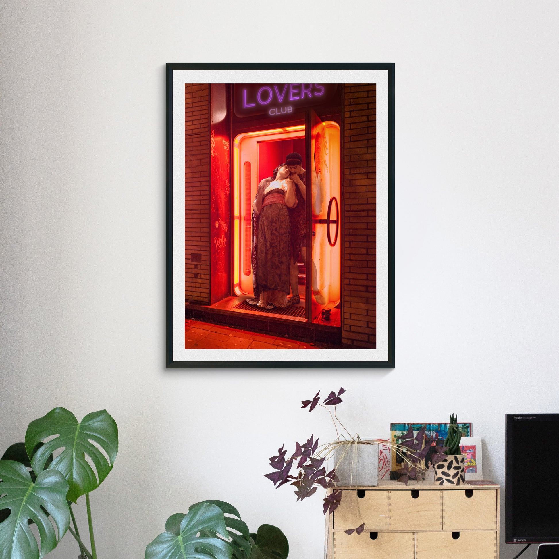 - "Step into the neon glow of forbidden romance. Lovers Club blends classical art with the raw pulse of the modern city — a timeless couple, frozen in tenderness, caught in the entrance of a red-light club that whispers secrets of passion and rebellion. Is it love, lust, or a moment suspended between both?"