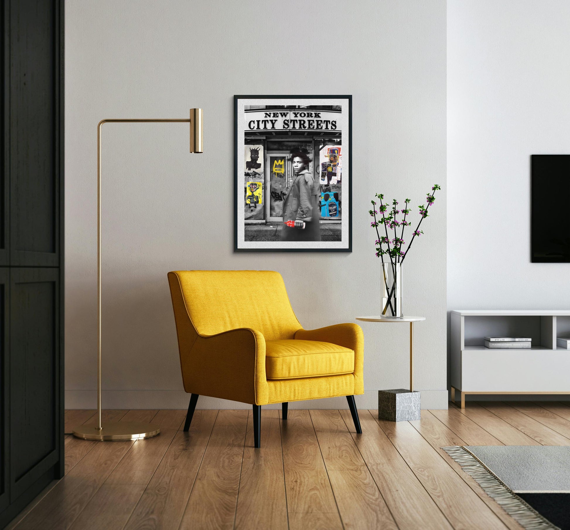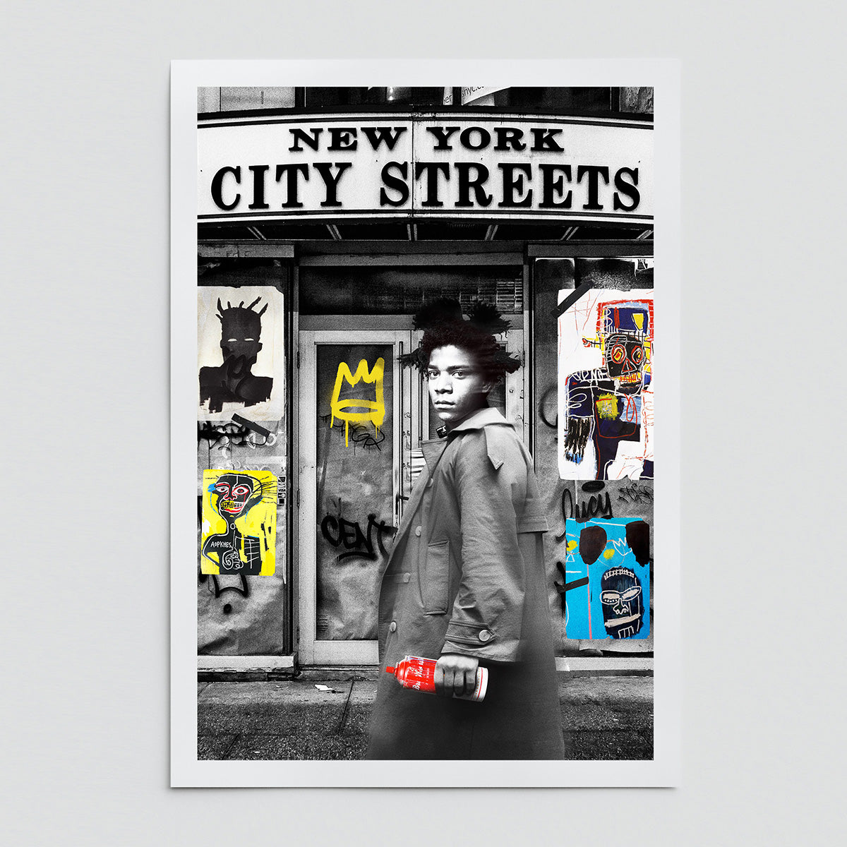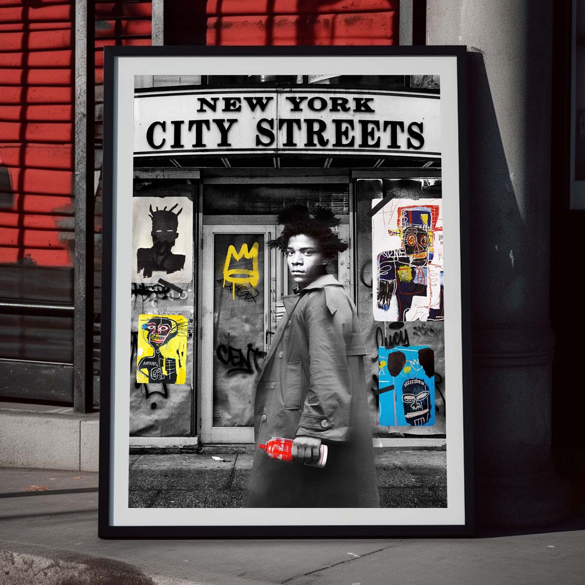 - "New York City Streets" is an ode to the vibrant urban energy inspired by one of the most influential artists, like Basquiat. This collage portrays his figure with a spray can, thus paying homage to the art of graffiti, so intrinsic to his work. This piece captures the expressive essence of the city, where street art intertwines with urban culture in a unique and powerful way. It's a celebration of the creativity and diversity that defines New York, as well as a reminder of Basquiat's enduring legacy in the global art scene.