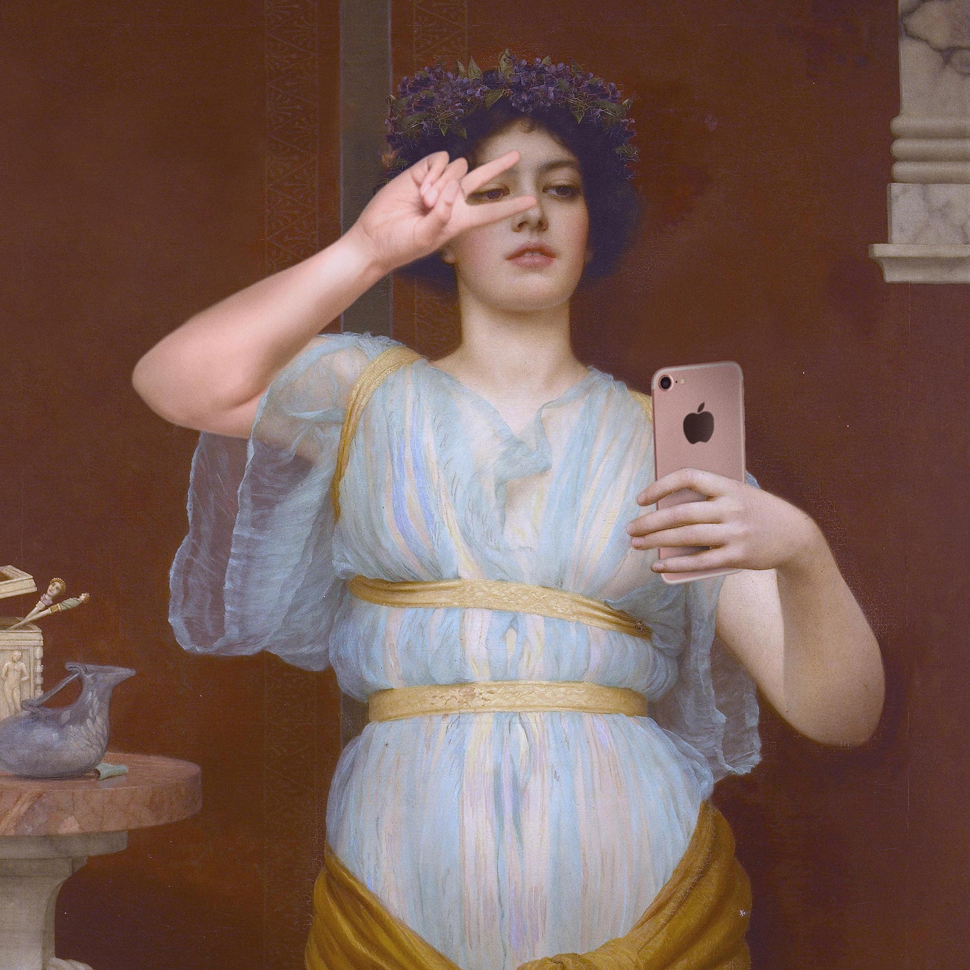 • "Selfie Diva" is a curious collage piece that satirizes the current world of social media poses, selfies, posturing, and the obsession with instant photography by incorporating the most iconic character in art history. With a touch of parody and humor, an iconic woman from famous neoclassical masters becomes the protagonist of this piece. This fusion of the classic and the contemporary offers an ironic look at how selfie culture and the pursuit of aesthetic perfection intersect with timeless beauty ideals.