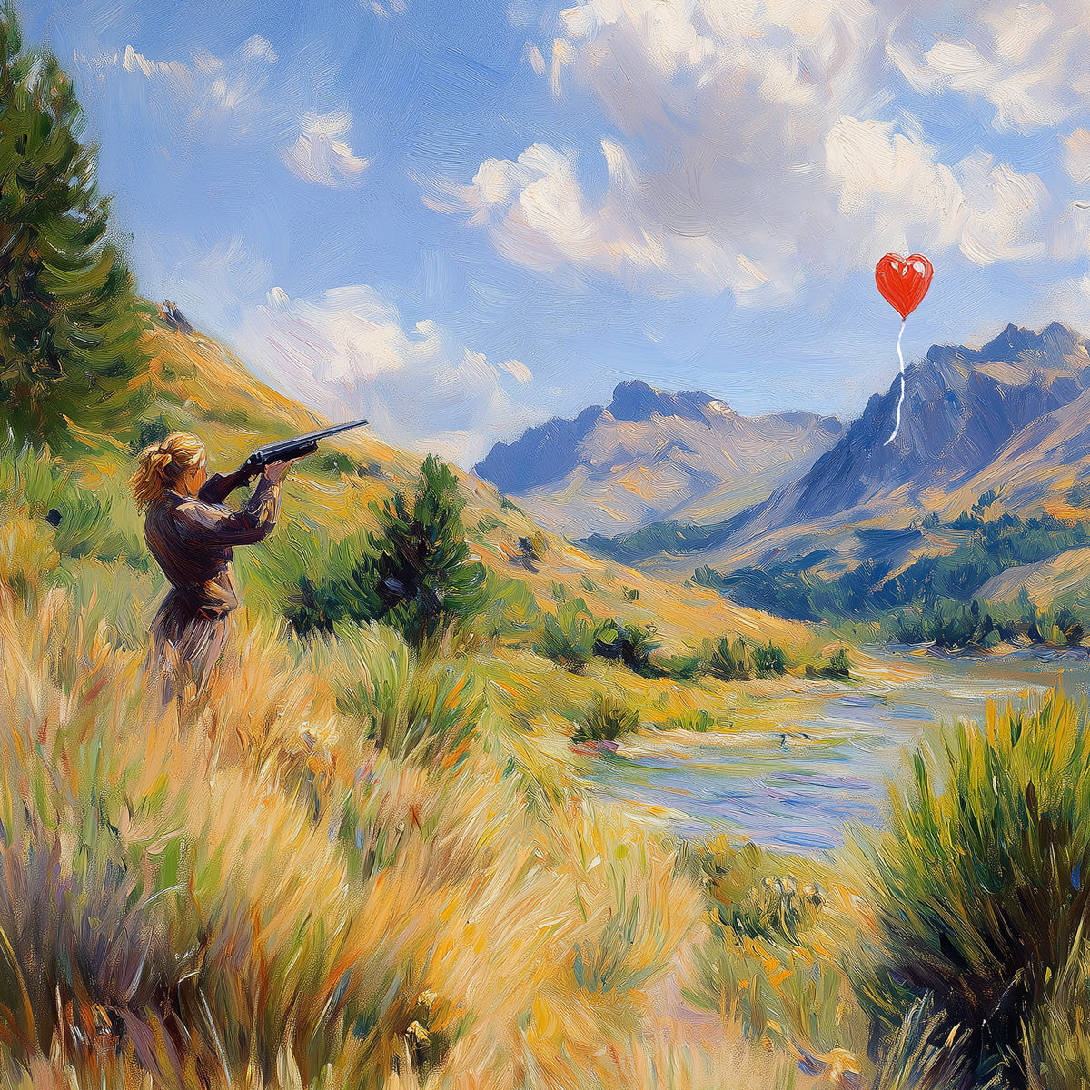• "Love in the air, shotgun in hand: sometimes you’ve got to shoot balloons down when they drift too high. She’s not breaking hearts, just sharpening her emotional aim. If love’s going to burst, it might as well be on her own terms."