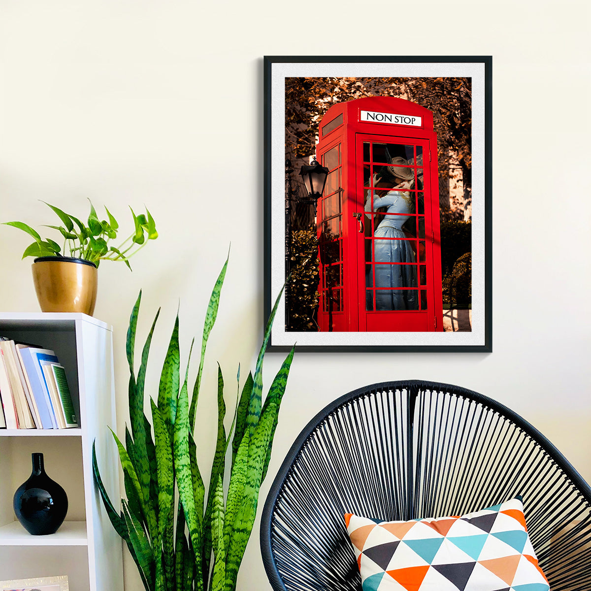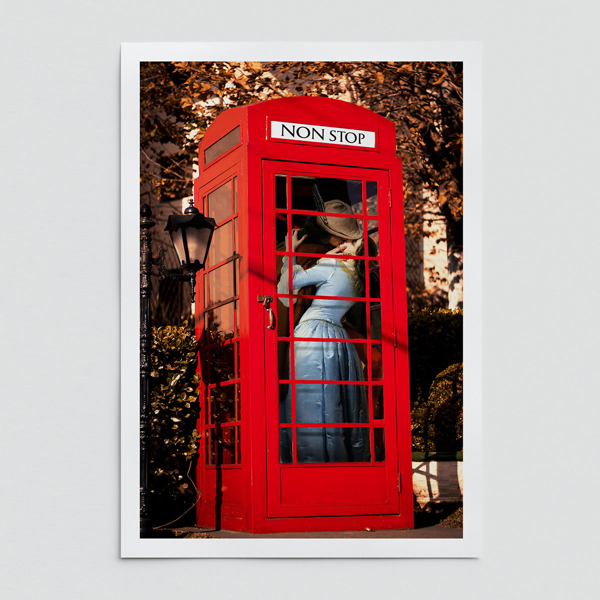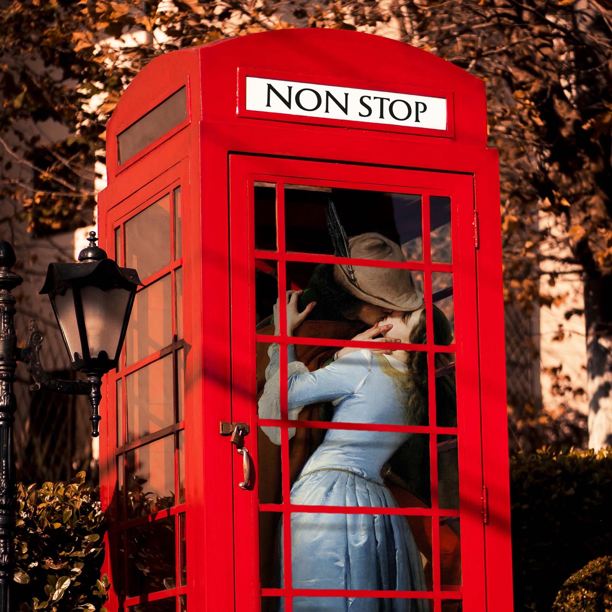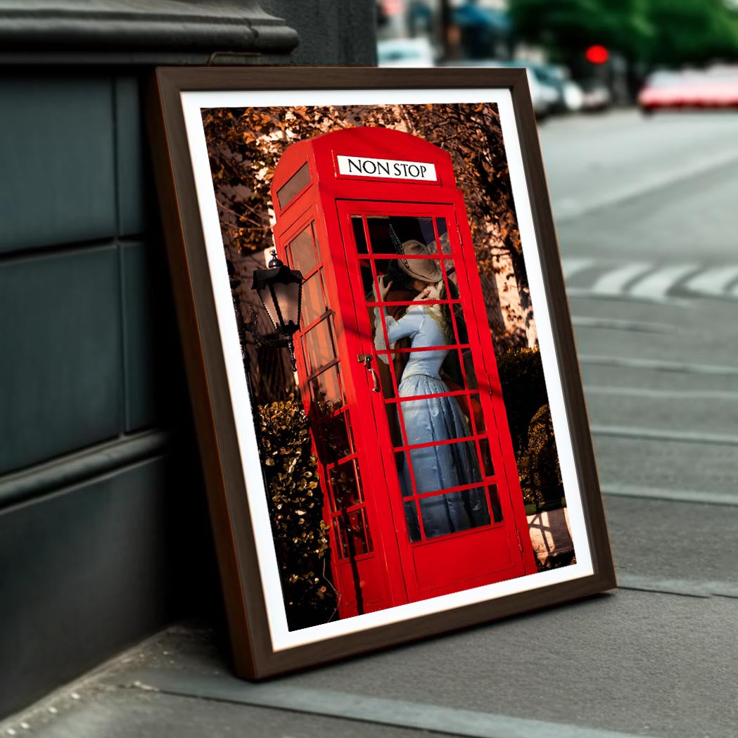 - "Shut up and kiss me" is an ode to love in this romantic collage that celebrates the intimacy of close distances. A couple melts into a passionate kiss inside an iconic british phone booth. The image evokes the magic of spontaneous encounters and the genuine connection between two people, while the phone booth adds a touch of nostalgia and urban romance.