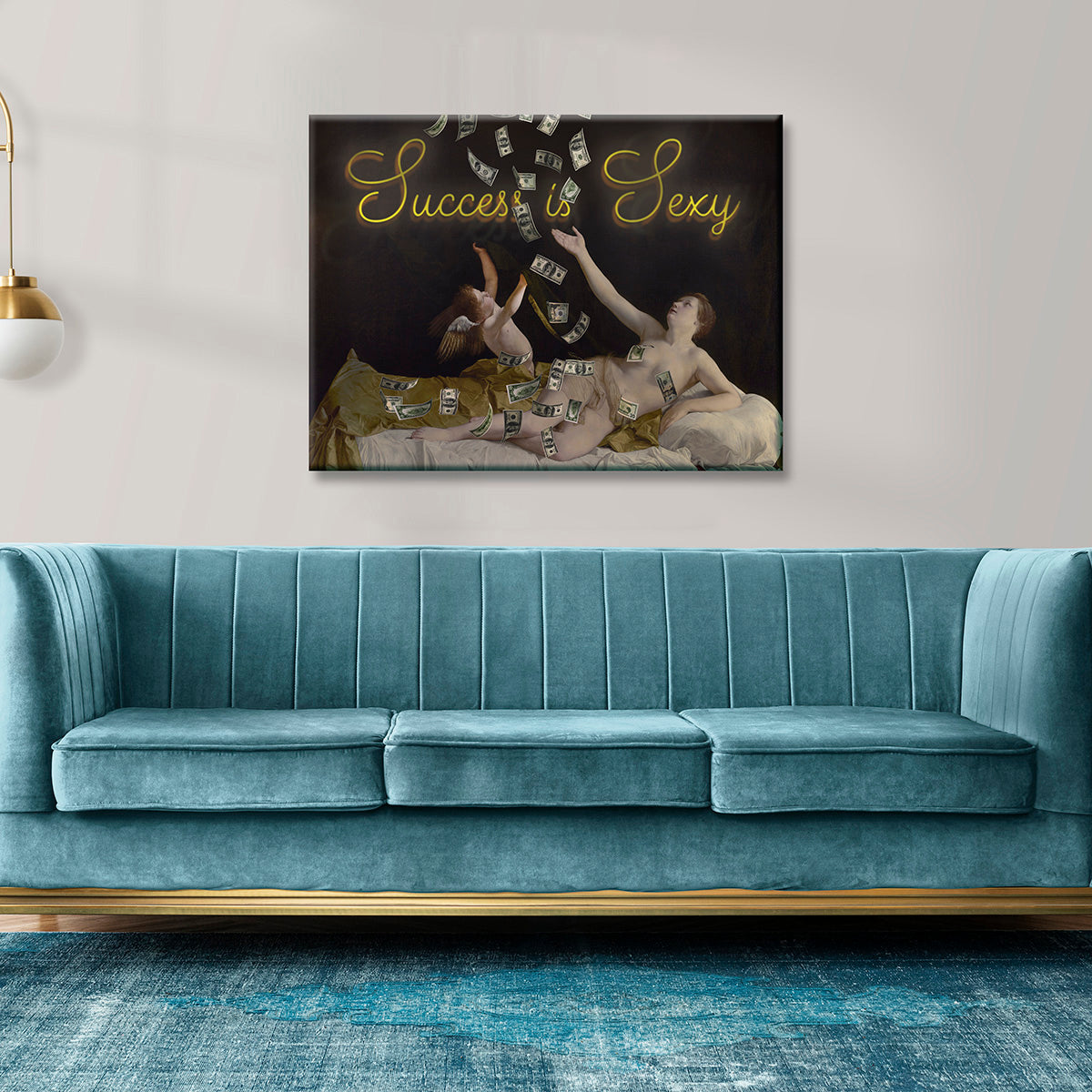 • "Success is Sexy" is a collage-style piece that satirizes the obsession with success and money, exploring the dichotomy between neoclassical paintings and modern elements. This artwork features a fusion of styles, where the classic blends with the contemporary in an ironic and provocative manner. It questions the perception of elegance and beauty associated with success while subtly criticizing consumerism and materialism culture.