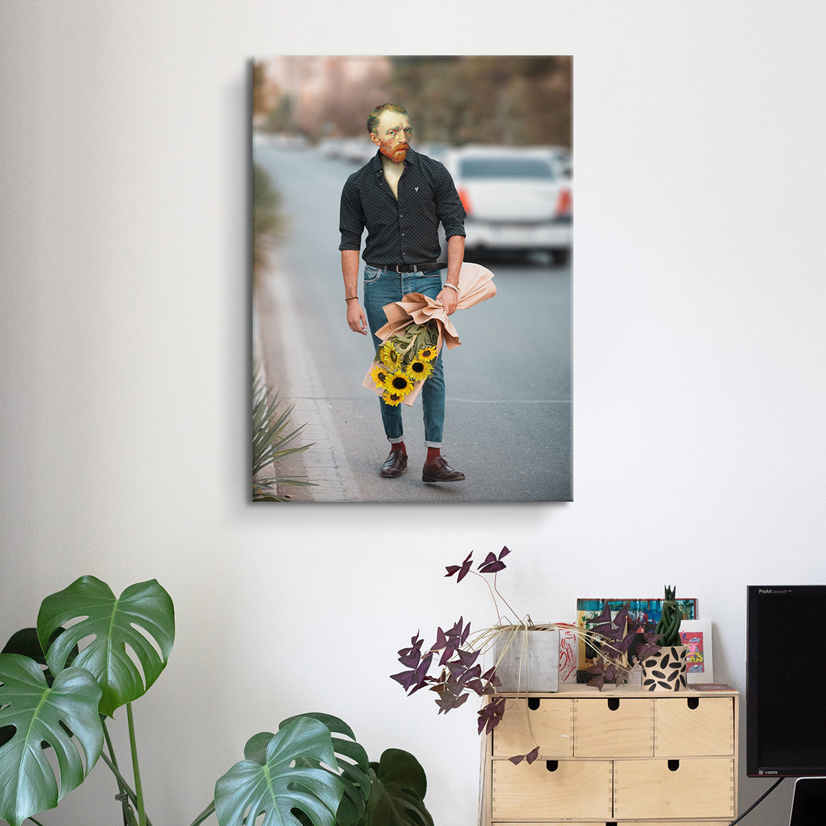 - In this funnypiece, we witness Van Gogh holding a bouquet of sunflowers in an unusual scenario: it's his first romantic date! With a touch of irony and comedy, this parody of the great Dutch master offers a clever and fresh twist. Using digital collage techniques, a neo-pop image is created, drawing inspiration from the artist's iconic self-portrait and reimagining it in a new context.