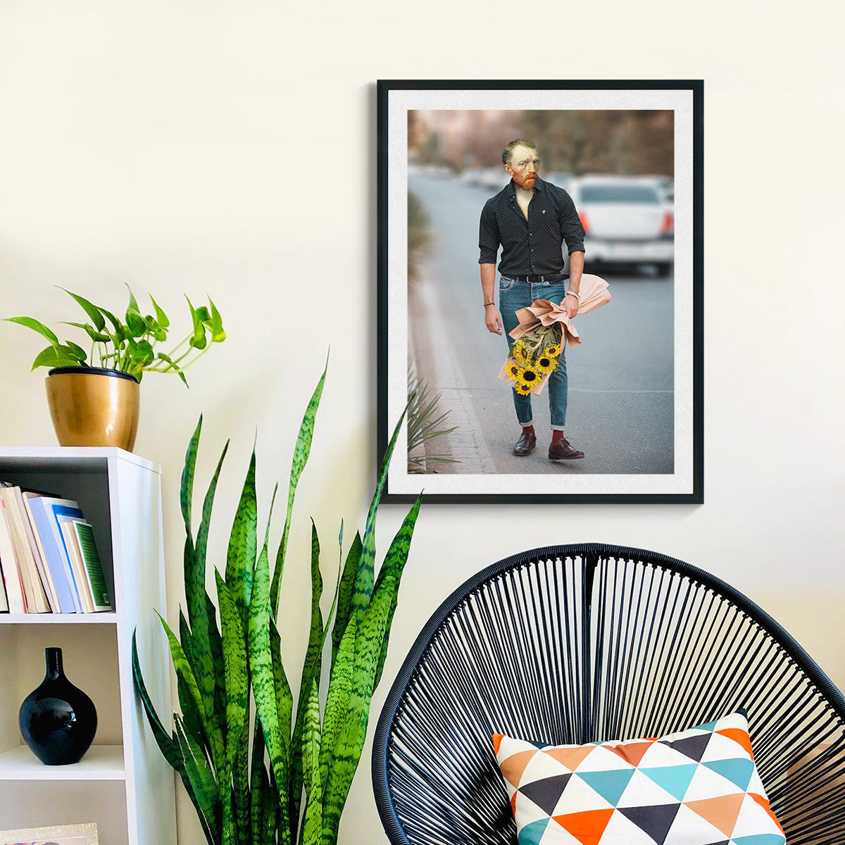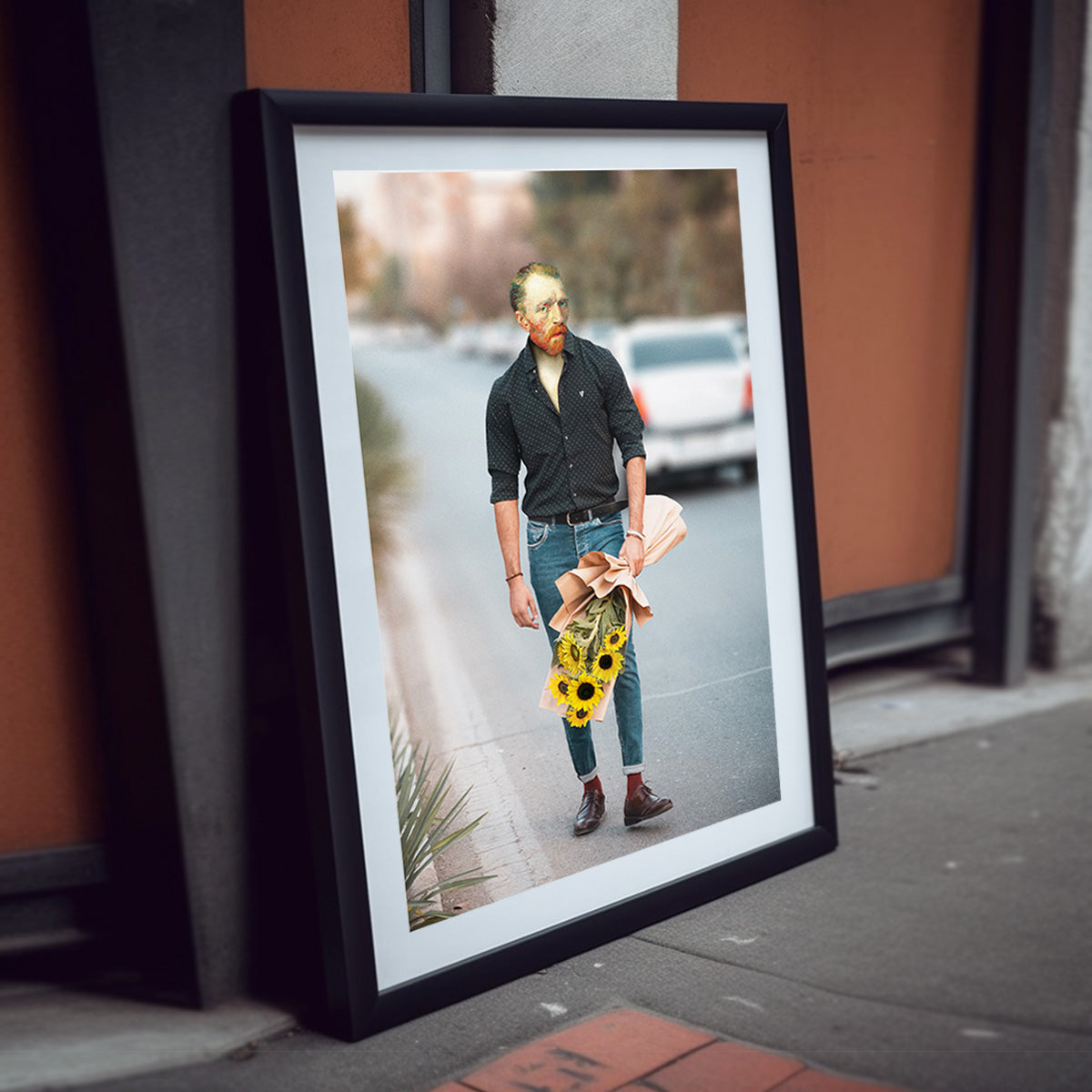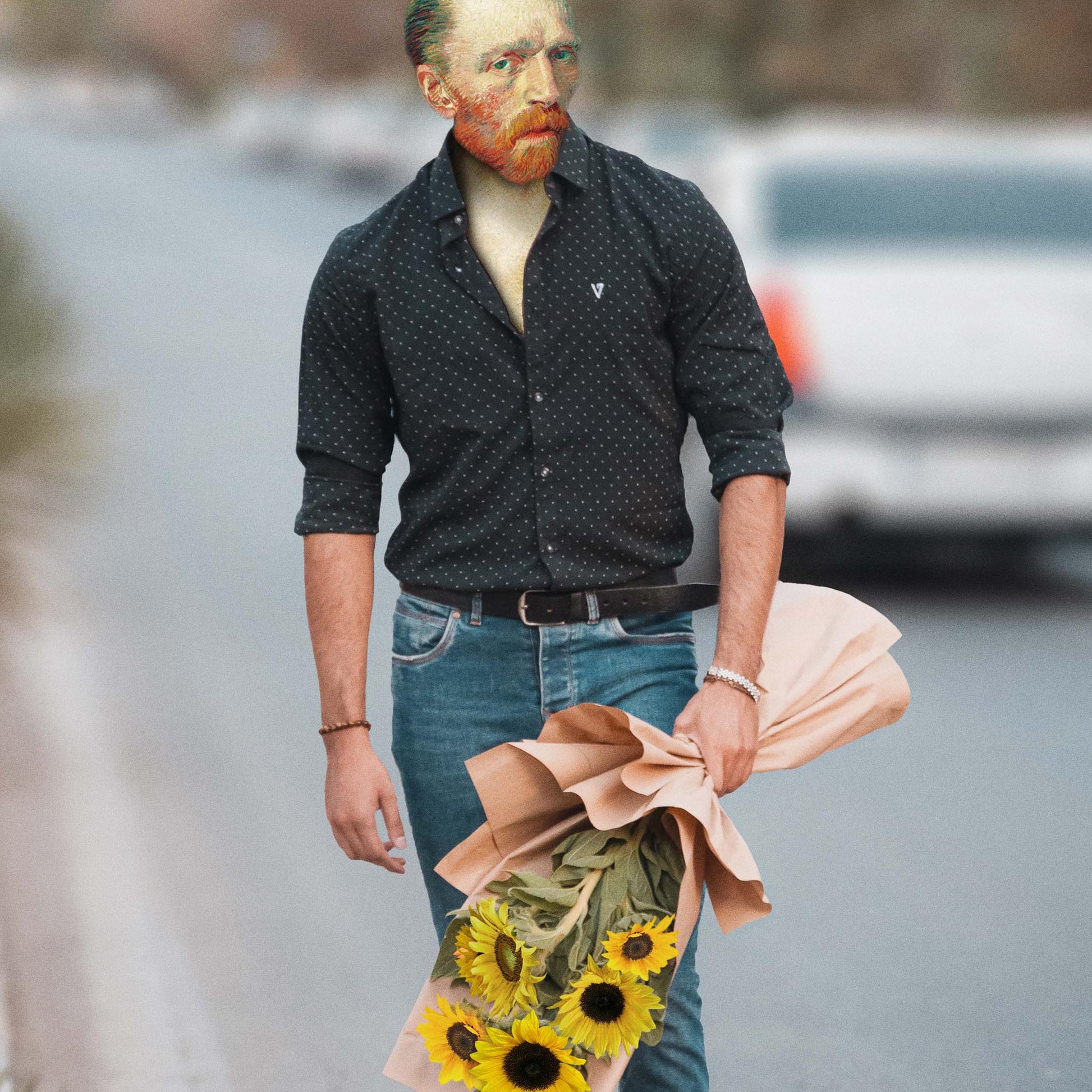 - In this funnypiece, we witness Van Gogh holding a bouquet of sunflowers in an unusual scenario: it's his first romantic date! With a touch of irony and comedy, this parody of the great Dutch master offers a clever and fresh twist. Using digital collage techniques, a neo-pop image is created, drawing inspiration from the artist's iconic self-portrait and reimagining it in a new context.