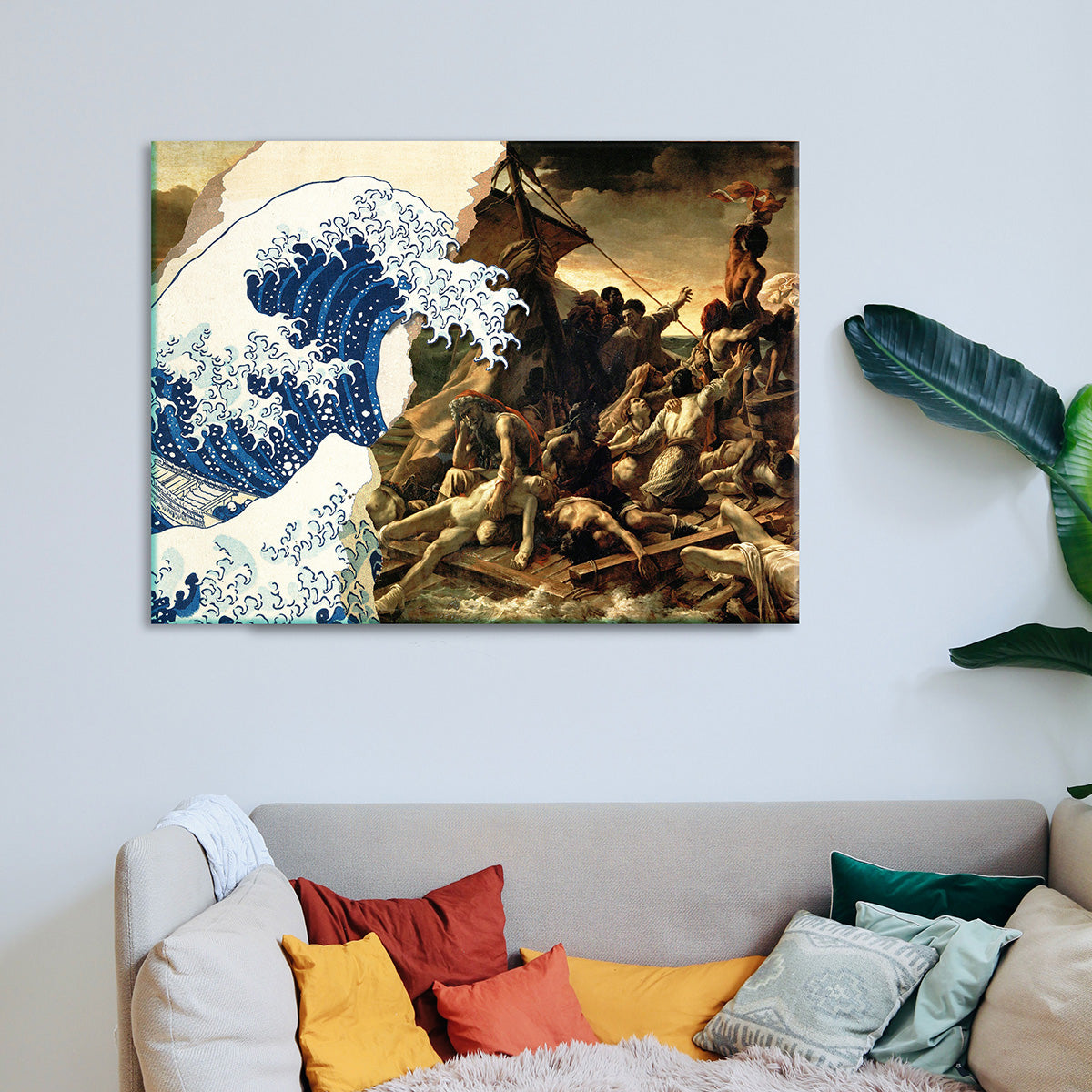 - Imagine a piece that blends two of the most iconic paintings in art history: "The Raft of the Medusa" by Géricault and "The Great Wave" by Kanagawa. In this new interpretation, these two masterpieces converge in a vibrant collage that challenges the conventions of traditional art. The desperation and tragedy depicted in "The Raft of the Medusa" intertwine with the majesty and power of "The Great Wave".