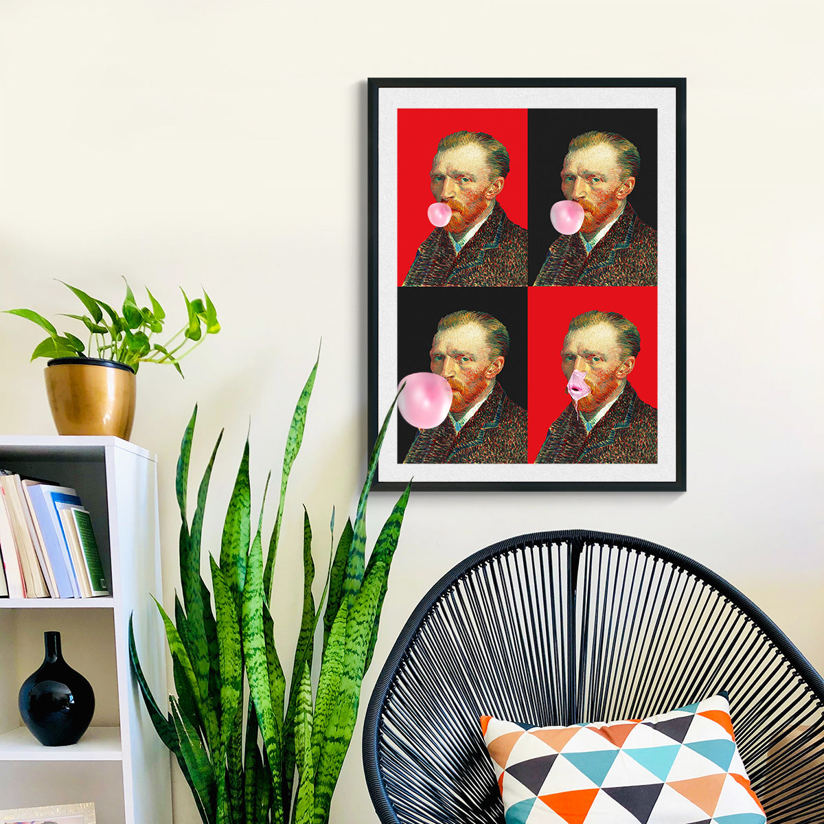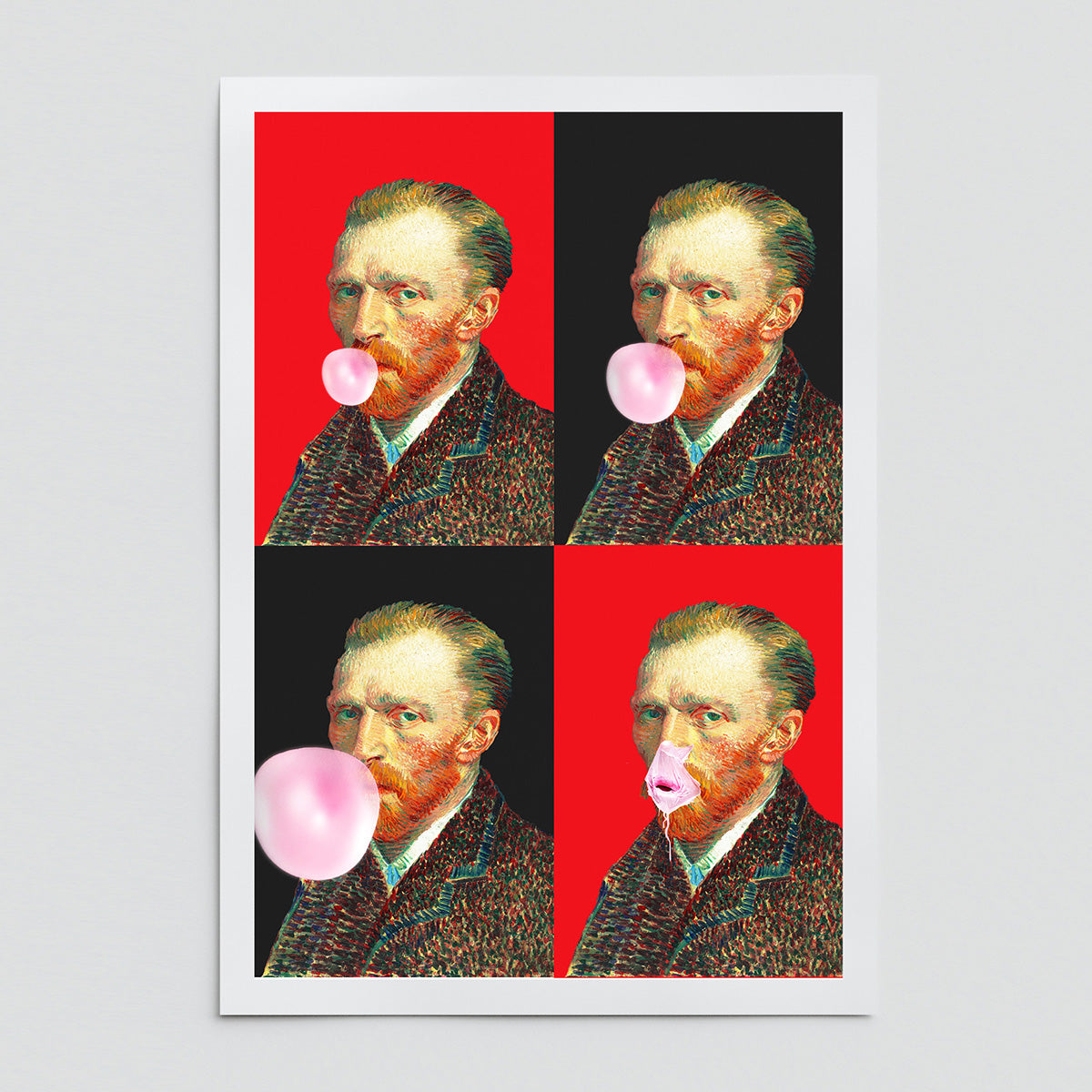 • Vincent has jumped on the bubble gum trend in all portraits, but with an unexpected twist. Merging repetition and pop art style sequence mixed with one of his most iconic self-portraits.