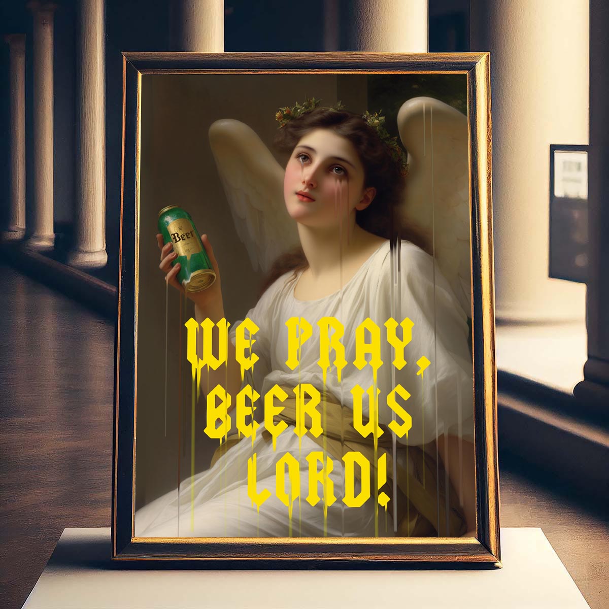 • "We Pray, Beer Us Lord" is a unique tribute to the divinity of beer, merging the solemnity of neoclassical art with the energy of urban style. In this artwork, classical iconography is combined with modern elements to celebrate the culture and enjoyment of an ancient beverage.